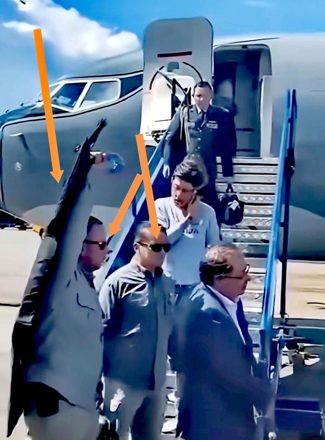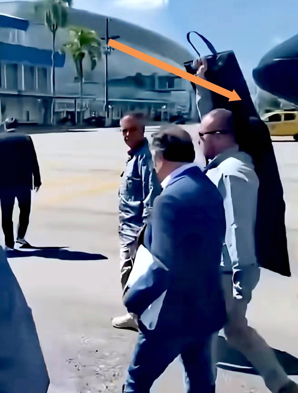 劲爆!最高级别防护(VIP),保镖折叠盾全程大开严防,安保人员手拿高举折叠盾。 从下飞机、与接待人员握手问候、机场行走…,堪称世界顶级安保,就是为了两个字“安全”。 另一个安保人员手提一个包包,这个就不知道是什么?所有安保人员都佩戴黑色墨镜,难道就是传说中的“透视镜”吗? 这样安保给人窒息的压迫感。
