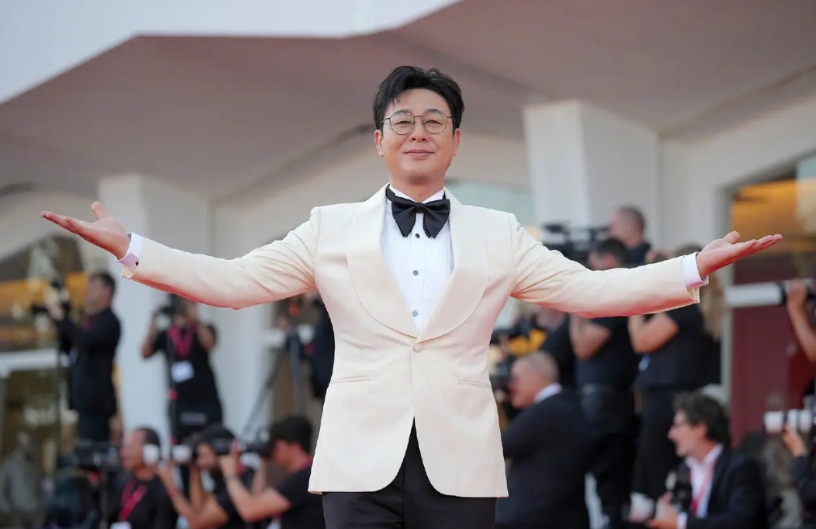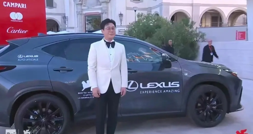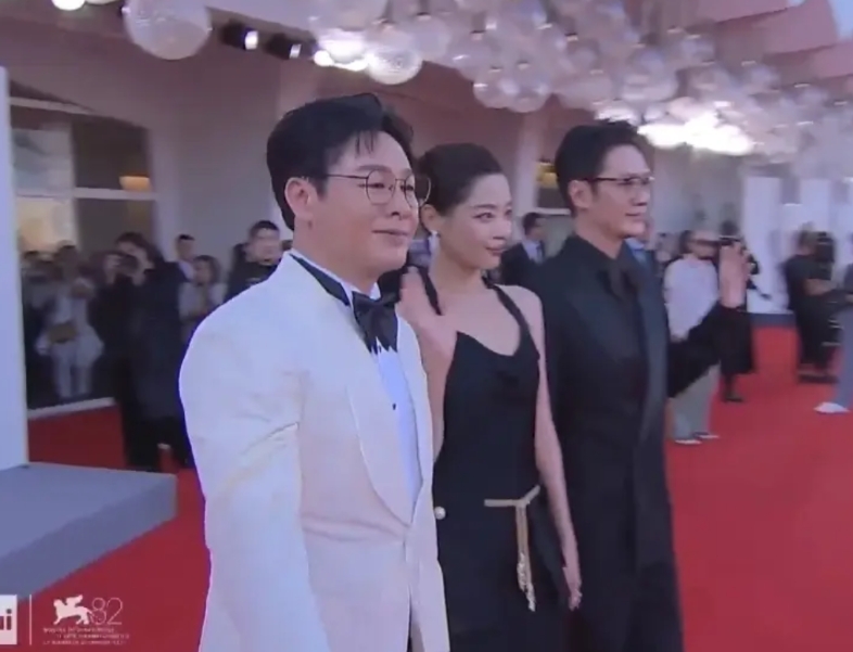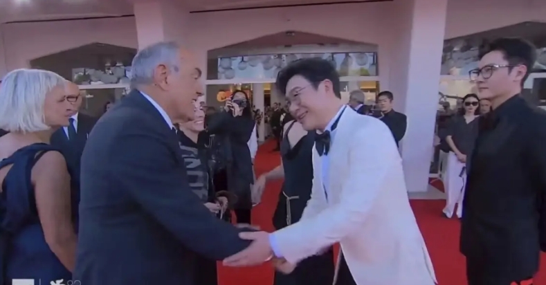 电影《日掛中天》今天在威尼斯电影节结束,随后剧组人员走红毯。张颂文在电影发布会上