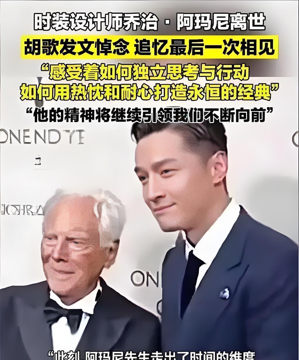 2025年9月4日,意大利时尚大师乔治·阿玛尼辞世,胡歌深夜发文悼念:“与Gio