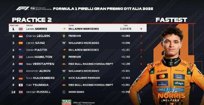 赛车:2025F1意大利大奖赛一二练成绩 一练: 法拉利一二,汉密尔顿1:20.