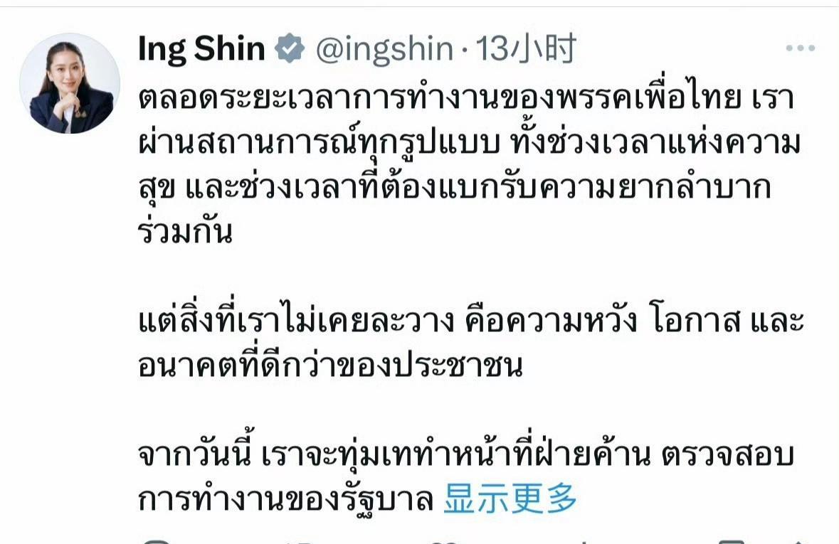 阿努廷当选总理后,泰国前总理佩通坦第一时间表示为泰党愿赌服输,佩通坦称为泰党将全