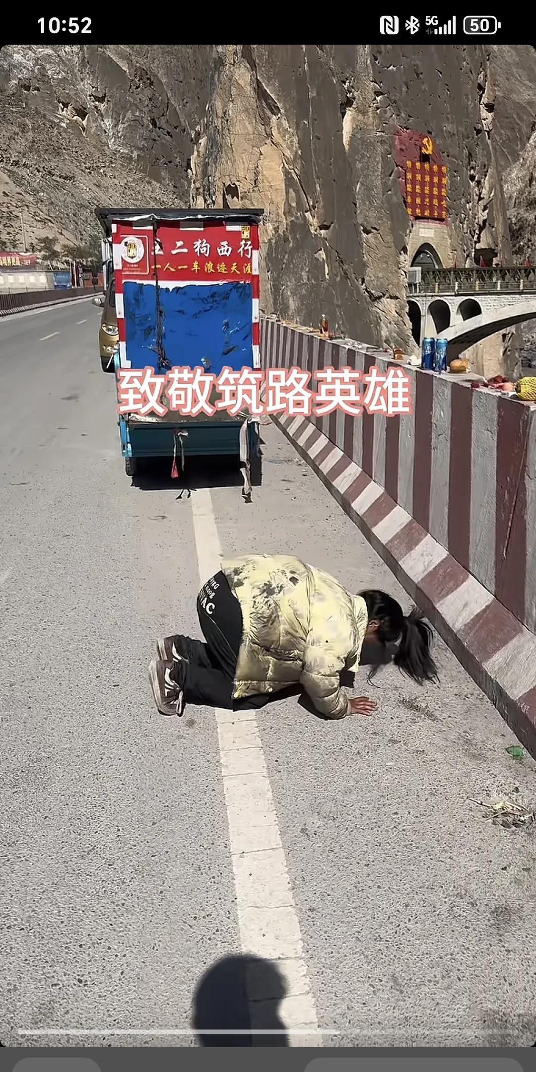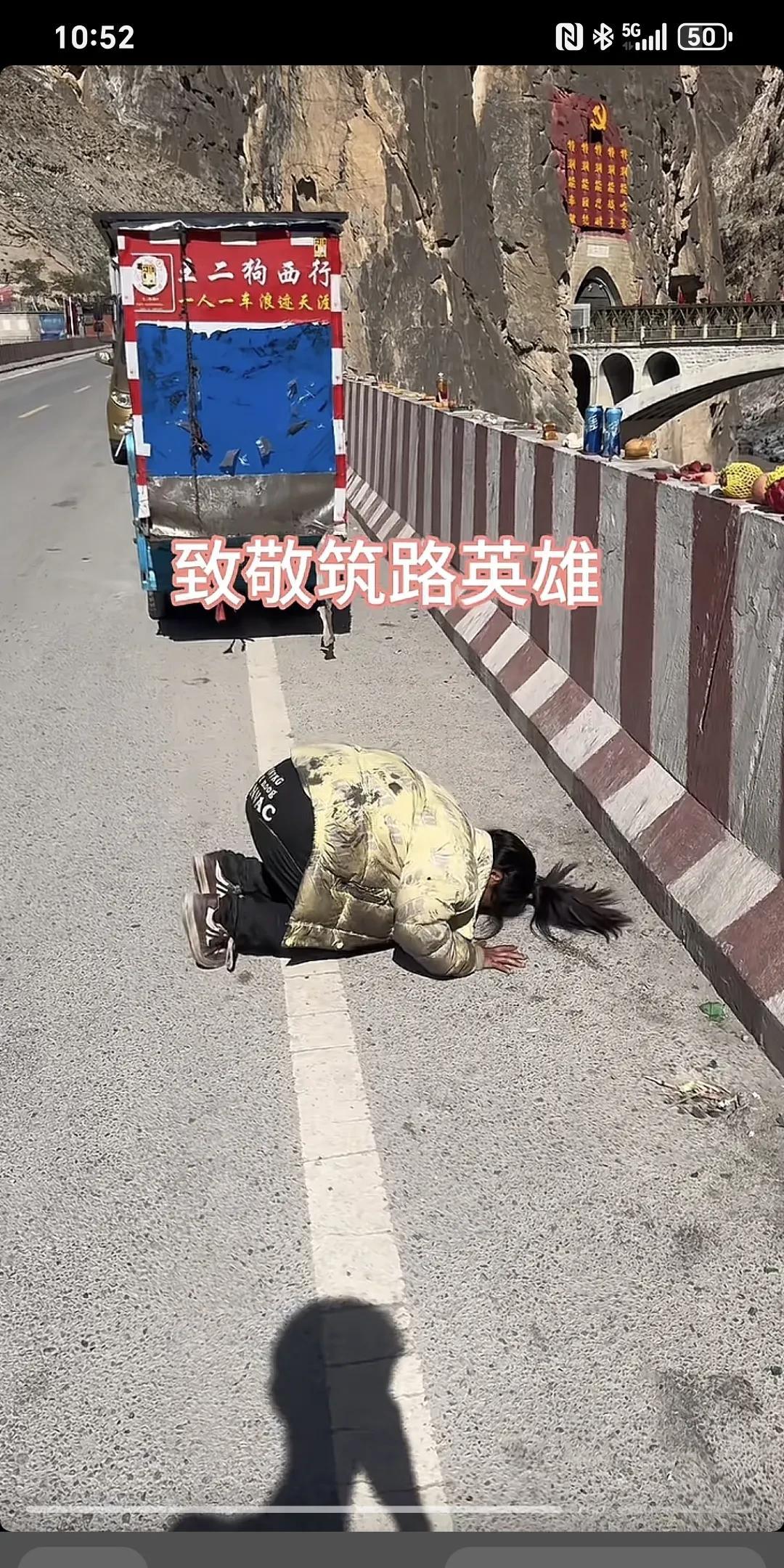 致敬筑路英雄~ 狗妹历经千辛万苦,从江西徒步拉萨,路过怒江大桥也不忘长眠在桥墩里的烈士和牺牲的筑路英雄,跟狗妹点赞加油。 唉,姑娘,有心了,只有平民百姓才能理解,因为牺牲了的解放军都是兄弟姐妹,看得我热泪盈眶,泪流满面,愿好人一生平安! 走过难路的人,都知道敬畏拿出性命的奉献者,而那些在平坦道路上走贯了的人,他们的内心不是敬畏,而是想着下次谁来奉献。为拿出生命奉献的人点赞。 看到的是形式,感受到的是敬仰!先烈必须永远铭记,英雄应该被敬仰[祈祷][祈祷][祈祷]#怒江大桥精神# #致敬筑路牺牲的烈士#