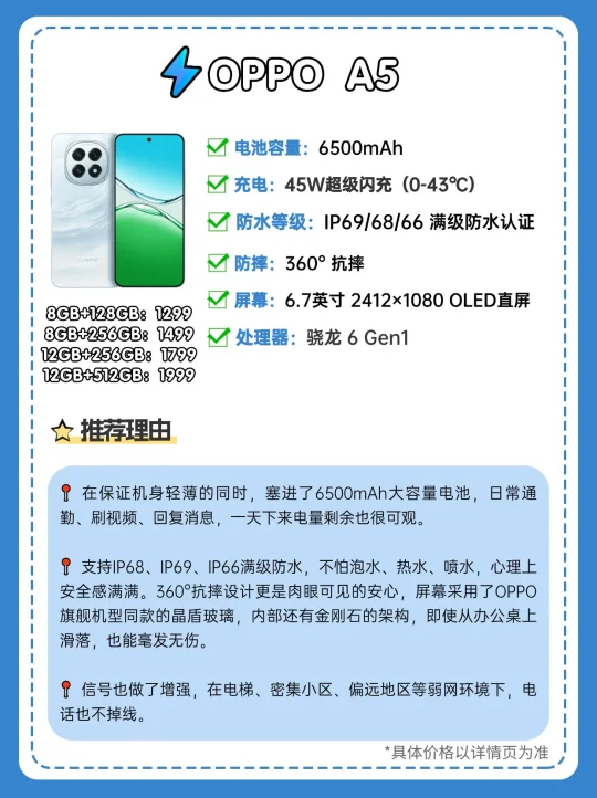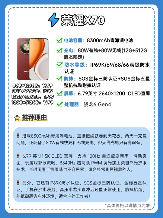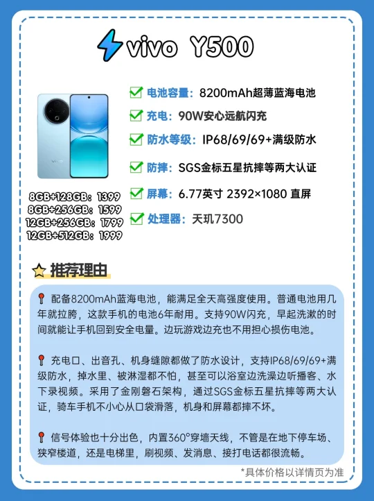 给大家挑出来三款2000元档位电池容量大、性价比高的手机,真的能治好你的电量焦虑! 📱续航 荣耀X70和vivo Y500的电池容量都很顶,荣耀X70搭载8300mAh电池,两天一充没问题。还配备了80W有线快充和无线充电,但无线充电只有高配有。 vivo Y500是8200mAh蓝海电池,能满足全天高强度使用。而且电池耐用寿命长达6年,比普通电池更长久。 OPPO A5在保证机身轻薄的同时,塞进了6500mAh电池,日常通勤、刷视频、回复消息,一天下来电量剩余也很可观。 📱防水 vivo Y500充电口、出音孔、机身缝隙都做了防水设计,支持IP68/69/69+满级防水,掉水里、被淋湿都不怕。 荣耀X70有IP66/68/69/69K防水认证,手机在沸水浸泡、高压水龙头直冲后还能正常使用。 OPPO A5支持IP68、IP69、IP66满级防水,不怕泡水、热水、喷水,心理上安全感满满。 📱防摔 vivo Y500采用了金刚磐石架构,通过SGS金标五星抗摔等两大认证,骑车手机不小心从口袋滑落,机身和屏幕都摔不坏。 荣耀X70拿下了SGS金标三防+金标五星认证,能抵御恶劣户外环境! OPPO A5的360°抗摔设计是肉眼可见的安心,从办公桌上滑落,也毫发无伤。 📱信号 vivo Y500信号体验十分出色,搭载360°穿墙天线,在地下停车场、楼道、电梯里使用很流畅。 荣耀X70搭载了荣耀鸿燕通信,在偏远地区用手机,信号大幅提升。 OPPO A5的信号也做了增强,在电梯、密集小区等弱网环境下,电话也不掉线。 ✅总结: 👉荣耀X70好在有8300mAh大容量电池,充电方式多样,1.5K护眼屏幕,高清流畅,长时间盯着不容易觉得累; 👉OPPO A5兼顾了手感和续航,长时间举着刷剧也不会胳膊发酸,防水抗摔给力,严寒酷暑,都能快速补能; 👉vivo Y500好在有8200mAh大电池+90W快充,电池耐用6年,防水抗摔能力、信号能力、音量也是拉满。 同12GB+512GB内存规格下,三款手机都是1999元,大家可以根据喜好选购。但值得一提的是,目前vivo Y500正处于首销期,购机享4年电池宝+1年进水宝等超值优惠,国补后12GB+512G规格只售1699,性价比真的拉满! 你还用过什么续航比较顶的2000元神机吗,欢迎推荐~
