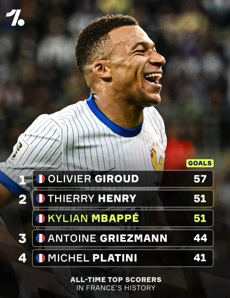 他已经追平蒂埃里·亨利,成为法国队历史第二射手