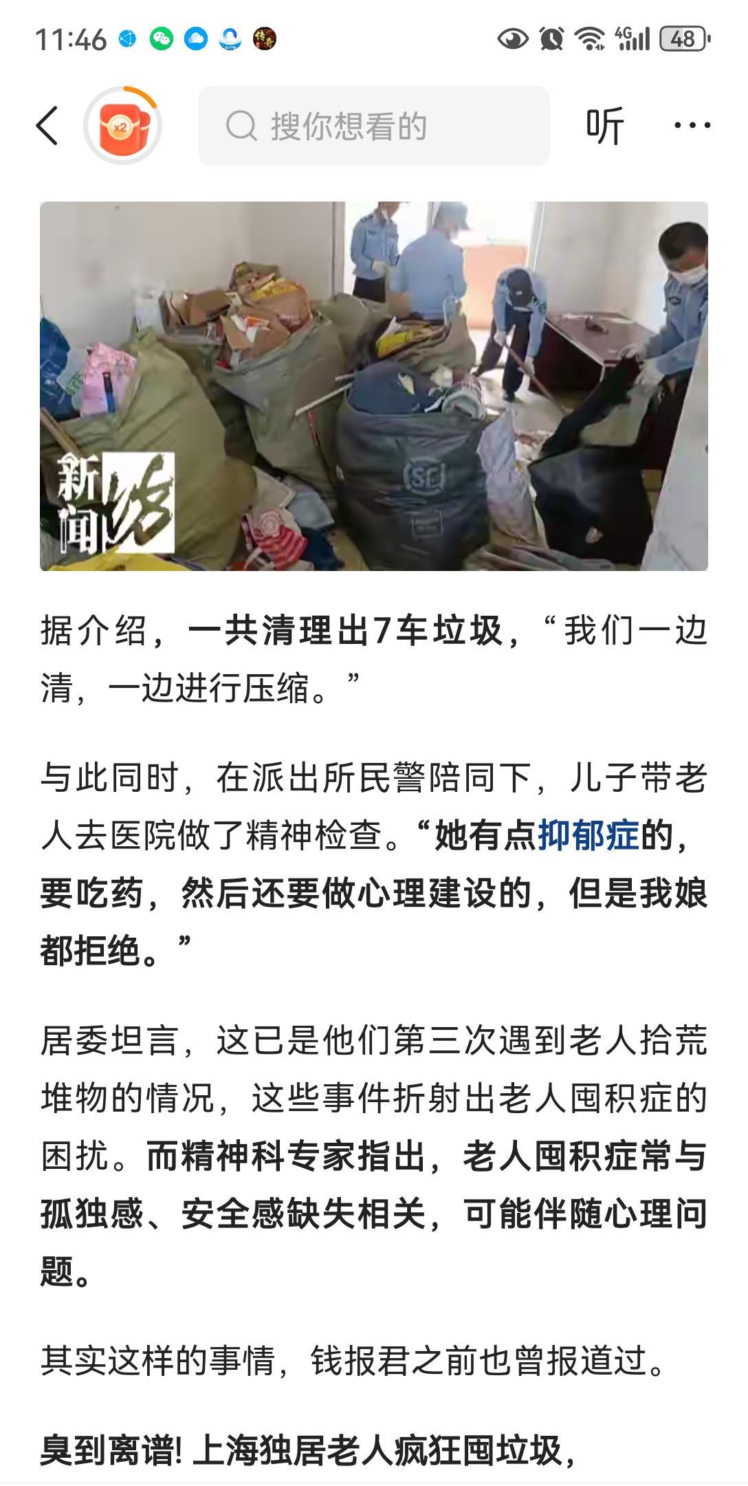 囤积综合征,是心理疾病,其实不分年龄性别,只不过到了七八十岁的老人阶段,各种囤积垃圾的行为,已经是达到登峰造极、无人能管的地步了[不看][不看][不看]。 像图中这种程度的,除非住进精神病院,按时吃药、系统治疗,不然,无解。因为,他们只要还能动弹,就会不停往家里捡垃圾、堆垃圾……甭管是子女、亲属、物业、社区,谁都不可能7*24小时盯着她,对吧? 美剧英剧,有好多囤积综合征的剧情,比如,某个成年女子突然失踪了,警察最后终于在她老妈的别墅里,把尸体给翻出来了——作为重度囤积综合征患者,她女儿去看望她时,被屋里的垃圾给砸倒了、淹没了、慢慢压死了……