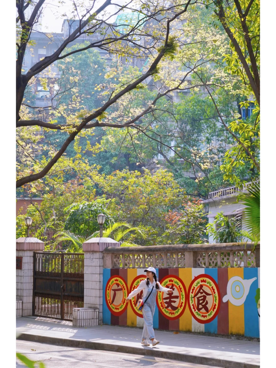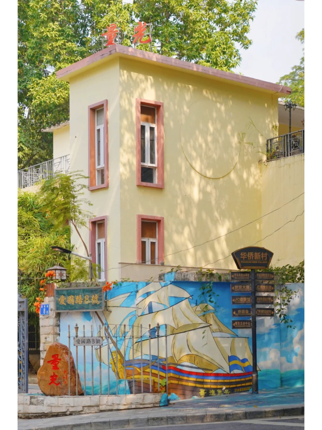🌸 华侨幼儿园路段:超大彩色涂鸦墙,大多数小伙伴都喜欢顺着转弯路口往上拍。不妨走过幼儿园回头看,涂鸦墙上有一棵较大的树开满了白色小花,花香四溢(图2⃣ )