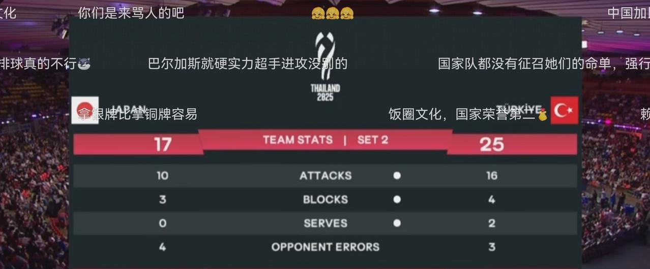 世锦赛半决赛,土耳其女排第二局25-17胜日本女排,大比分双方打成1-1平了。