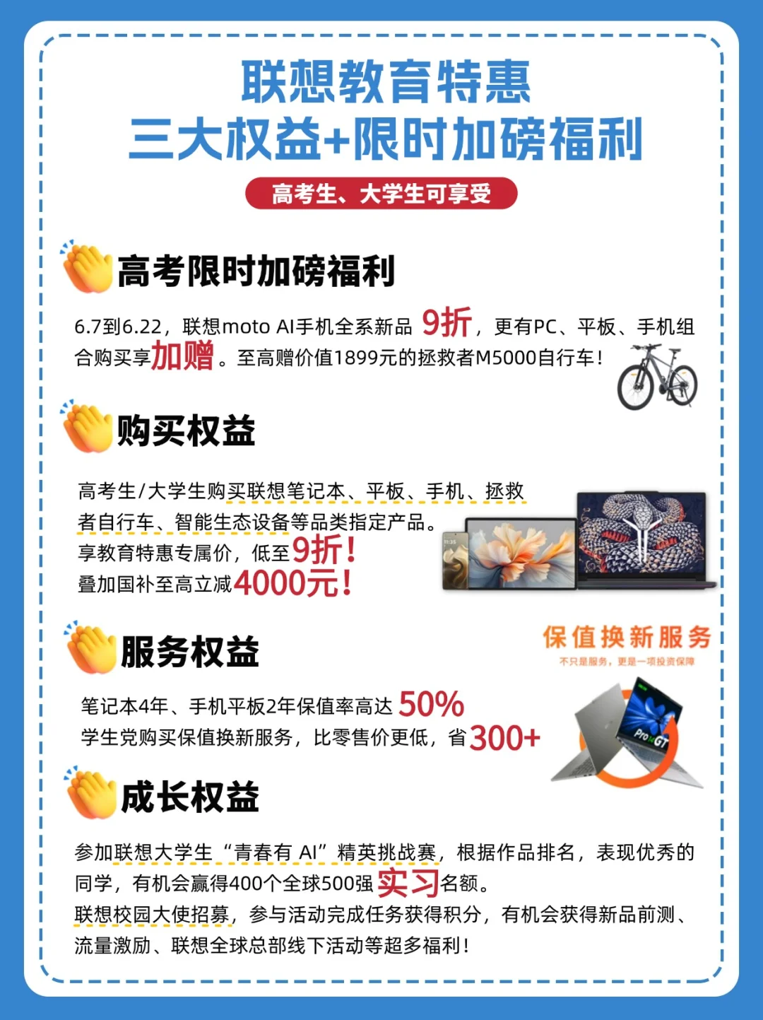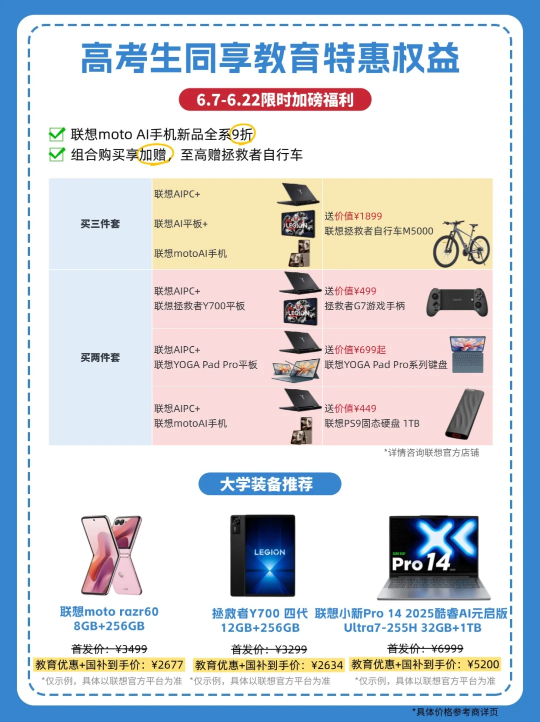 教育特惠产品低至9折:高考生/大学生认证身份后买联想笔记本、平板、手机、拯救者自行车等产品,享教育特惠价,叠加国补至高立减4000元!