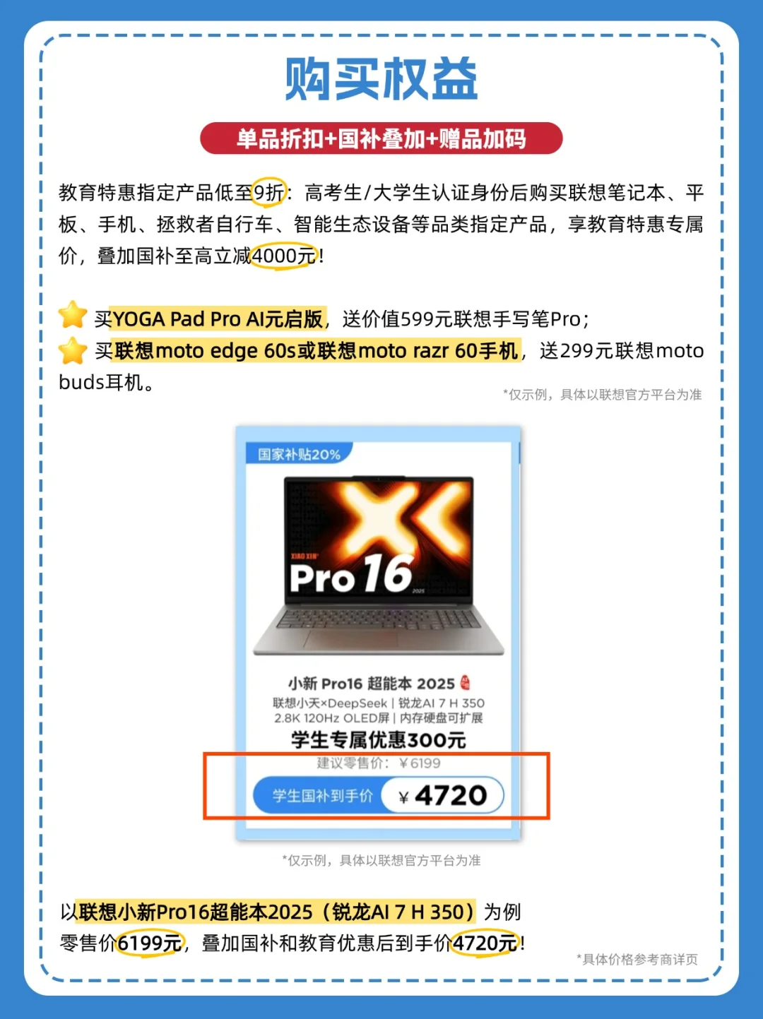 就拿联想小新Pro16超能本2025(锐龙AI 7 H 350)来说,原价6199元,叠加国补和教育优惠后直接降到4720元,直接省出一个平板钱!