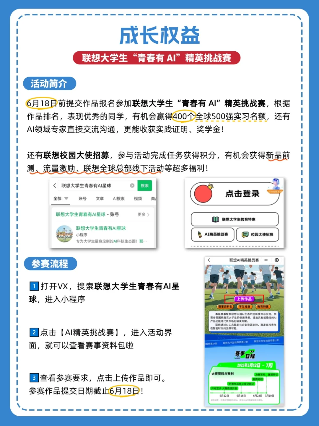 6月18日前提交作品报名参加联想大学生“青春有 AI”精英挑战赛,根据作品排名,表现出色的同学,有机会赢得400个全球500强实习名额,还有AI领域专家直接交流沟通,更能收获实践证明、奖学金!