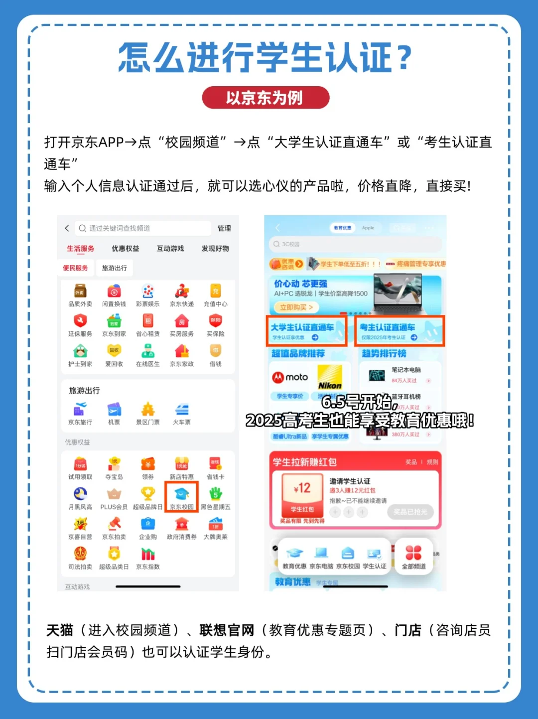 打开京东APP→点“校园频道”→点“大学生认证直通车”或“考生认证直通车”