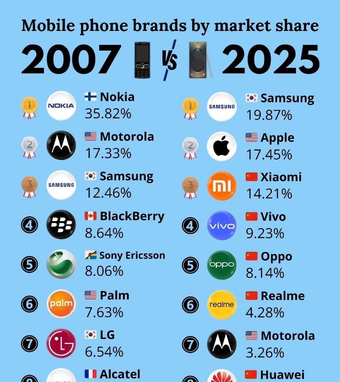 不到二十年的时间里,手机行业发生了翻天覆地的变化。 这种转变表明,创新、消费者需求和全球竞争能够迅速改变整个行业。昔日的巨头已成过去,而如今的冠军们仍在为移动技术的未来而战。