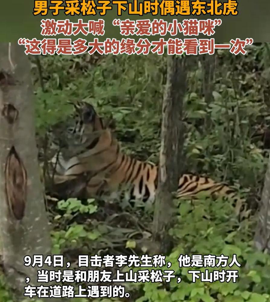 吉林珲春,一男子采松子下山时,突然看到旁边的树林中有动静,仔细一看竟然是一只东北虎趴在那里,男子不但没害怕,还对着它激动大喊“亲爱的小猫咪”!网友:猫咪要是搭理你你就完了 9 月 3 日那天,南方来的李先生和朋友一块上山采松子,忙活了大半天,傍晚时分,俩人开车慢悠悠下山,打算带着收获回家。 车子行驶在蜿蜒的山路上,周围都是茂密的树林,树叶被风吹得沙沙响,空气里满是山林特有的清新味儿。突然,李先生眼角瞥见旁边树林里有动静,像是有个大家伙在那儿。他赶紧放慢车速,仔细朝那边瞧去,这一瞧可把他惊着了,树林里竟然趴着一只东北虎! 那东北虎体型庞大,身上的条纹像精心绘制的图案,在斑驳的树影下,显得格外有力量感。它就那么安静地趴在草丛里,偶尔抬抬头,看看周围的动静,模样看起来还有几分慵懒。 按说一般人看到野生东北虎,不得吓得赶紧开车跑?可李先生不一样,他非但没害怕,反而激动坏了。可能是第一次这么近距离见到野生东北虎,他心里那股子兴奋劲儿压都压不住。 他朝着东北虎,声音里满是激动地喊起来:“亲爱的小猫咪!” 喊完还一个劲儿感慨,“这得是多大的缘分才能看到一次啊!”当时,东北虎离他们的车也就两米左右。 它似乎被这突如其来的喊声惊动了,站起身,慢悠悠地穿过马路,走到另一边的林子里,找了个舒服的地方又躺下了,继续享受山林里的宁静。李先生看着东北虎身上那好看的花纹,心里的激动劲儿还是没过去,一个劲地跟朋友说,长这么大,头一回见野生东北虎,太震撼了。 这事很快就在网上传开了。网友们看到后,乐坏了,评论区热闹得不行。有人说:“这‘小猫咪’要是搭理你,你可就完了,跑都没处跑。” 还有人调侃:“南方人是没见过大猫吗?这可是能把车都挠坏的主儿。” 后来,李先生说起这事,还是难掩兴奋。他说自己是南方人,平时在老家,别说野生东北虎了,连老虎的影子都难见到。这次来珲春采松子,能遇上东北虎,真觉得是特别奇妙的缘分。 这事儿也让更多人关注到了吉林珲春的生态。珲春这地方,能让野生东北虎安心生活,说明这里的自然环境是真不错。也希望大家以后要是在野外遇到野生动物,能保持安全距离,既能好好欣赏它们,也能保护好自己。 对此你怎么看?欢迎大家在评论区留言讨论。 信源:城市晚报 发布于2025年9月5日