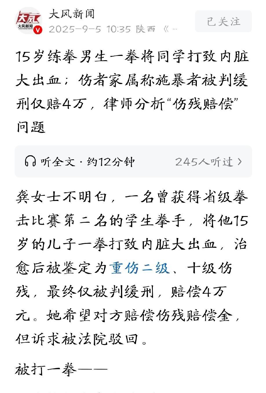 没天理了!云南禄丰,同学叫15岁男孩出去玩,男孩害怕对方打架闹事,就没有去赴约,谁知对方恼羞成怒,一拳捶在男孩肚子上。因为这名同学是练拳击的,力气特别大,男孩被打后直接疼晕,送医检查后,发现孩子内脏大出血,已达到重伤二级。男孩妈妈又急又气,闹上法庭,向对方索赔12万余元,但法院的判决让人意外。 云南禄丰的那个夜晚,15岁的张文不会想到,一次和朋友的小小“爽约”,会换来一张几乎毁掉他余生的人生账单。 打人的是同学马某,一个练过拳击、拿过省级亚军的少年。这一拳的力量,根本不是普通孩子打闹的级别。医院的诊断书冰冷又残酷:结肠破裂,腹腔大出血,失血性休克。简单说,一拳下去,肠子都快断了,命悬一线。 抢救过来后,医生给出的鉴定是重伤二级,十级伤残。这串名词意味着,张文的身体里永远留下了一道疤,剧烈运动和体力活,都可能带来撕裂般的剧痛。 身体的伤口或许能缝合,但心里的黑洞却在不断扩大。事发当晚,张文疼得无法走路,是朋友郭栋把他扶回旅馆的。凌晨一点,施暴者马某通过别人微信发来一句道歉,恐惧中的张文只能口头说“接受”。 从深夜三点痛到昏迷,再到第二天中午才被送到诊所,那种无助和绝望,没人能体会,后来,诊断书上又添了新的字眼:重度抑郁,重度焦虑。这个曾经爱打篮球的少年,精神世界已然崩塌。 更让人五味杂陈的是法律的天平。张文的母亲龚女士提起了诉讼,要求追究对方的刑事责任,并索赔医疗、护理等费用共计12万余元,其中近9万是伤残赔偿金。 而在赔偿问题上,法院只支持了4万元,对那笔关键的伤残赔偿金不予支持。施暴方在法庭上道了歉,但只愿意拿出4万元。 刑事附带民事诉讼,通常不支持精神损害和伤残赔偿。这个结果,在法律程序上或许说得通,但在情理上,却像在受害者家庭的伤口上又撒了一把盐。 2021年的上海,一个相似的案例却走向了不同的结局。学生小豪为劝架,被同学张龙一拳打中眼睛,同样造成十级伤残。 上海的法院最终判决,打人者父母承担70%的责任,赔了12万多;而学校因监管不力,承担了30%的责任,赔了6万多。同样是十级伤残,赔偿的落差如此巨大,龚女士不服,上诉被驳回,但她没有放弃,转而申诉。就在9月1日,法院决定对她的申诉立案审查。 对此,你怎么看?
