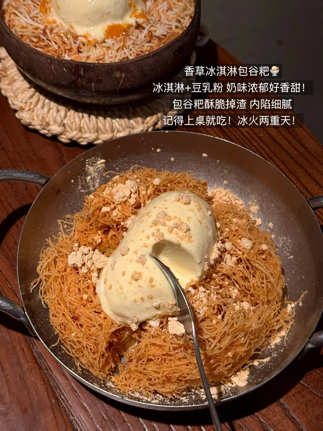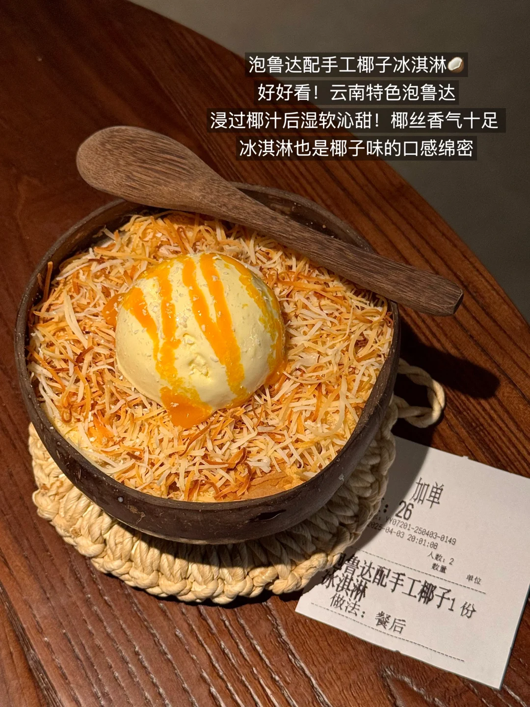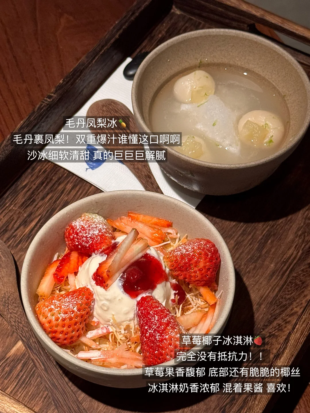 ✔️小菜/甜品类:草莓椰子冰淇淋/毛丹凤梨冰/香草冰激凌包谷粑/香草冰淇淋泡鲁达🥥…随便点都好吃!果味清新奶香浓郁 甚至吊打外面专门店!