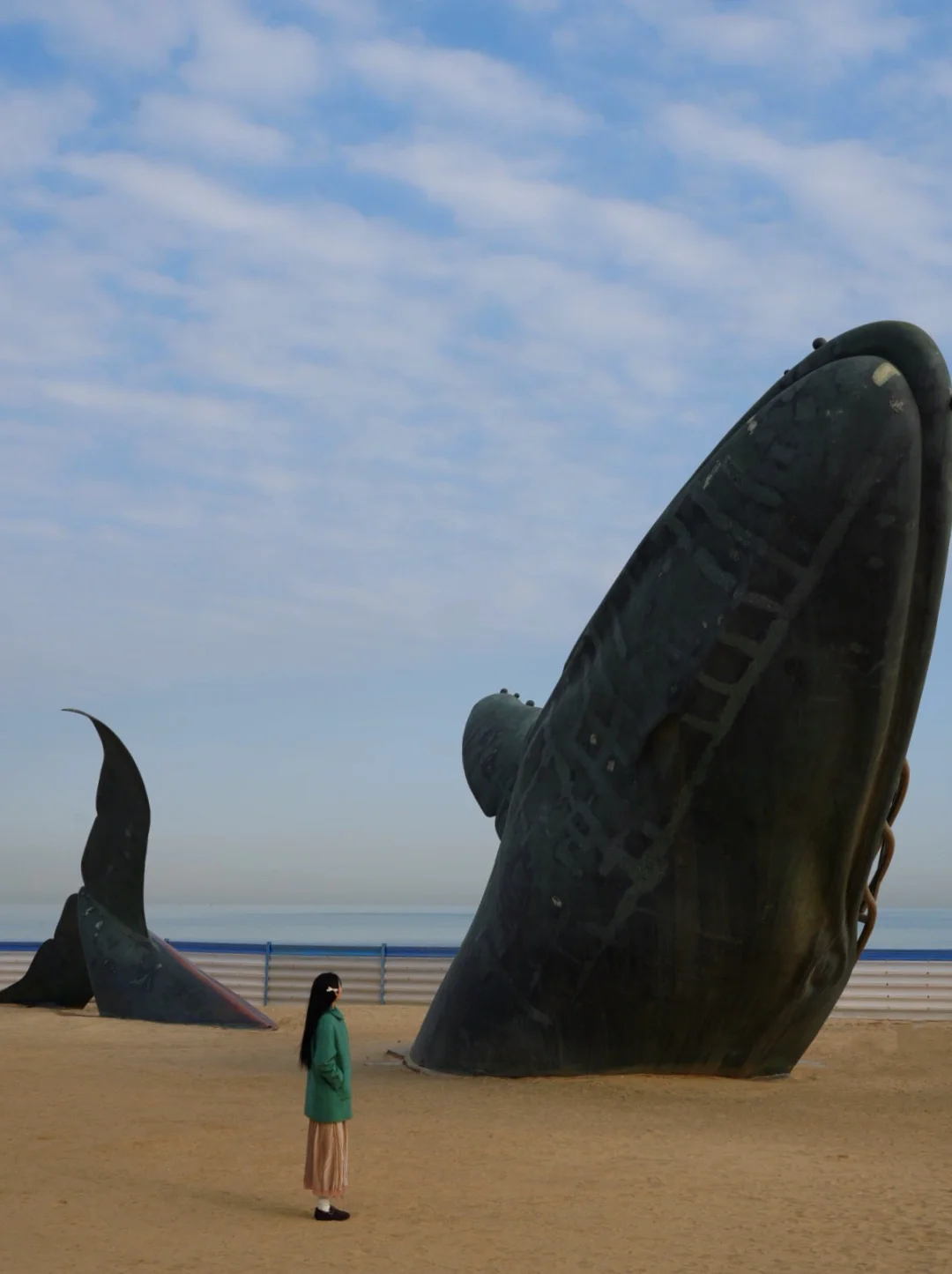 2️⃣孤独的鲸:烟台网红地标 巨型鲸鱼矗立沙滩 建议早起拍摄 避开人流