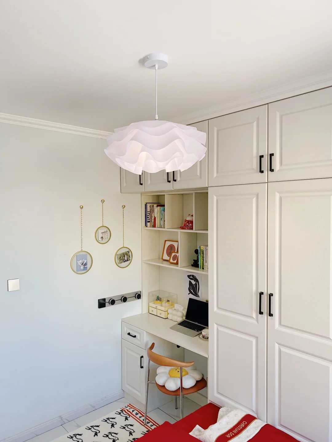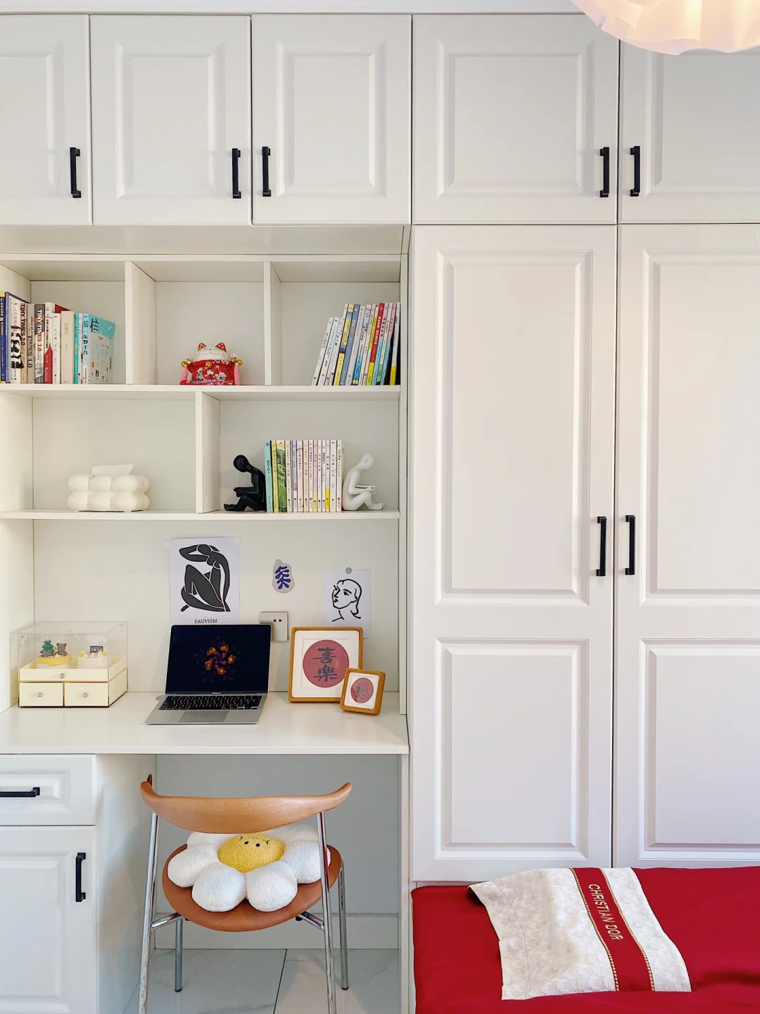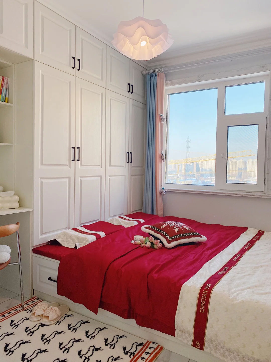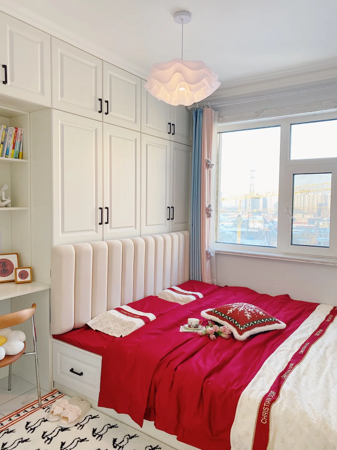 ²⁰²³/₁.₂🧨🧧 “烟火起 照人间 喜悦无边 举杯敬此年” 不知不觉2023年已经到来啦,把榻榻米卧室也布置了一下,新年氛围满满~ . 卧室长3.16m,宽2.7m,高2.7m 榻榻米卧室墙面是浅蓝色硅藻泥,地面通铺的白色系瓷砖。 吊灯是温柔的云朵吊灯,灯光很柔和,卧室都变得更加浪漫温馨啦! . 榻榻米长2m,宽2.3m,高0.4m 榻榻米是全屋定制的,九个柜体➕四个抽屉组成的,收纳空间增加了许多。 给榻榻米换上了红色四件套,软软糯糯的很舒适,搭配奶乎乎的床头靠垫,简直太惬意啦~ . 书桌长1.16m,宽0.5m,高0.8m 榻榻米旁还定制了书柜和书桌,书柜书桌一体的设计也很实用。 书桌上放着福和喜乐的装饰画摆件,可爱的🐰床边毯,都给卧室增添了新年的氛围。 . 今天的分享就到这里了,我们下次见啦!