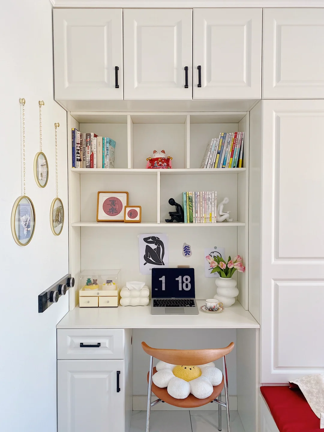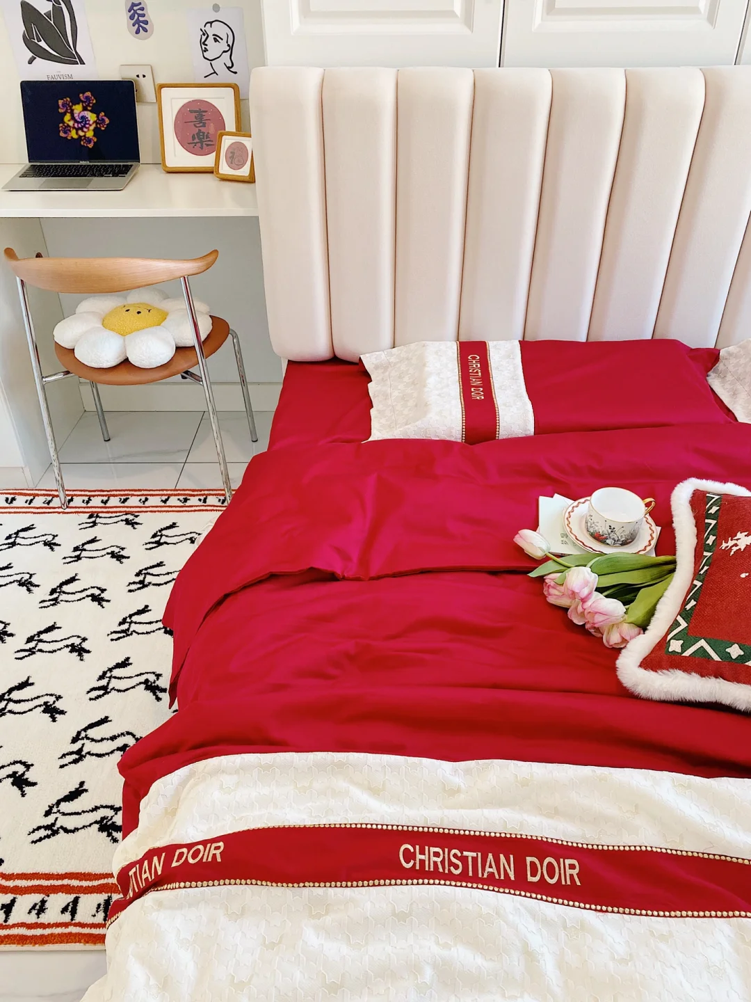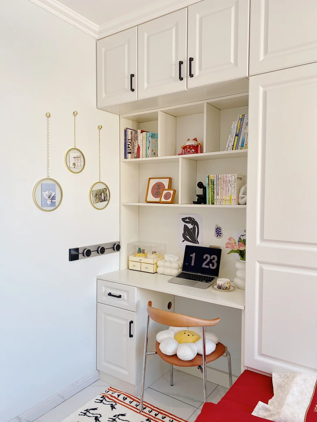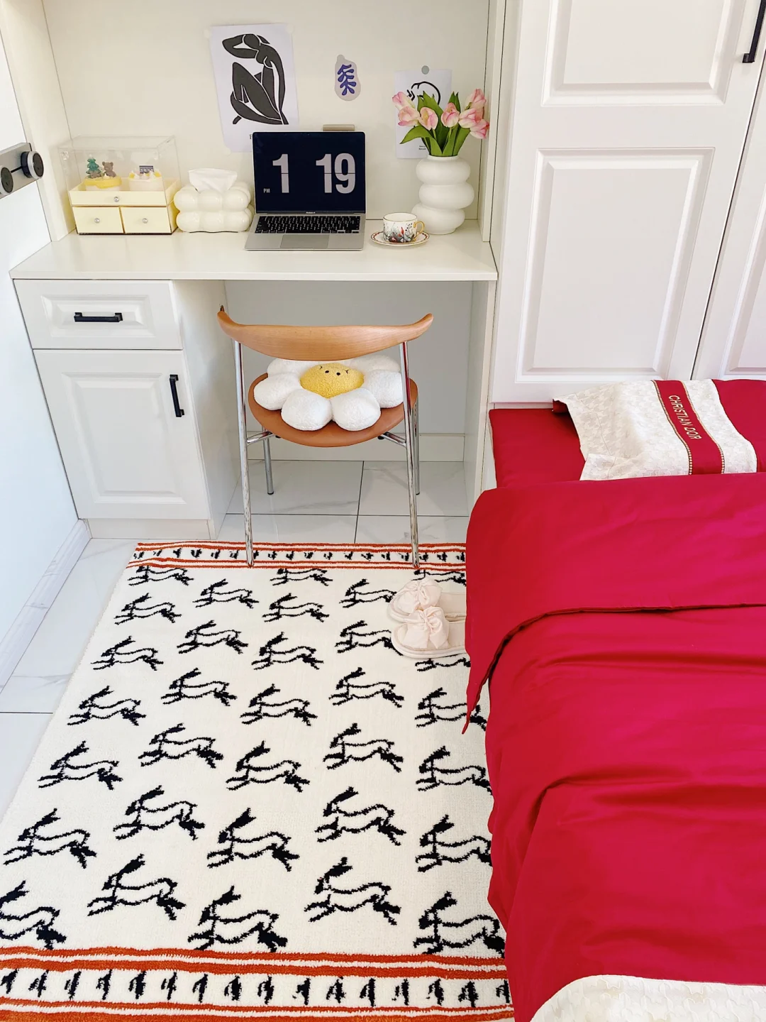 ²⁰²³/₁.₂🧨🧧 “烟火起 照人间 喜悦无边 举杯敬此年” 不知不觉2023年已经到来啦,把榻榻米卧室也布置了一下,新年氛围满满~ . 卧室长3.16m,宽2.7m,高2.7m 榻榻米卧室墙面是浅蓝色硅藻泥,地面通铺的白色系瓷砖。 吊灯是温柔的云朵吊灯,灯光很柔和,卧室都变得更加浪漫温馨啦! . 榻榻米长2m,宽2.3m,高0.4m 榻榻米是全屋定制的,九个柜体➕四个抽屉组成的,收纳空间增加了许多。 给榻榻米换上了红色四件套,软软糯糯的很舒适,搭配奶乎乎的床头靠垫,简直太惬意啦~ . 书桌长1.16m,宽0.5m,高0.8m 榻榻米旁还定制了书柜和书桌,书柜书桌一体的设计也很实用。 书桌上放着福和喜乐的装饰画摆件,可爱的🐰床边毯,都给卧室增添了新年的氛围。 . 今天的分享就到这里了,我们下次见啦!