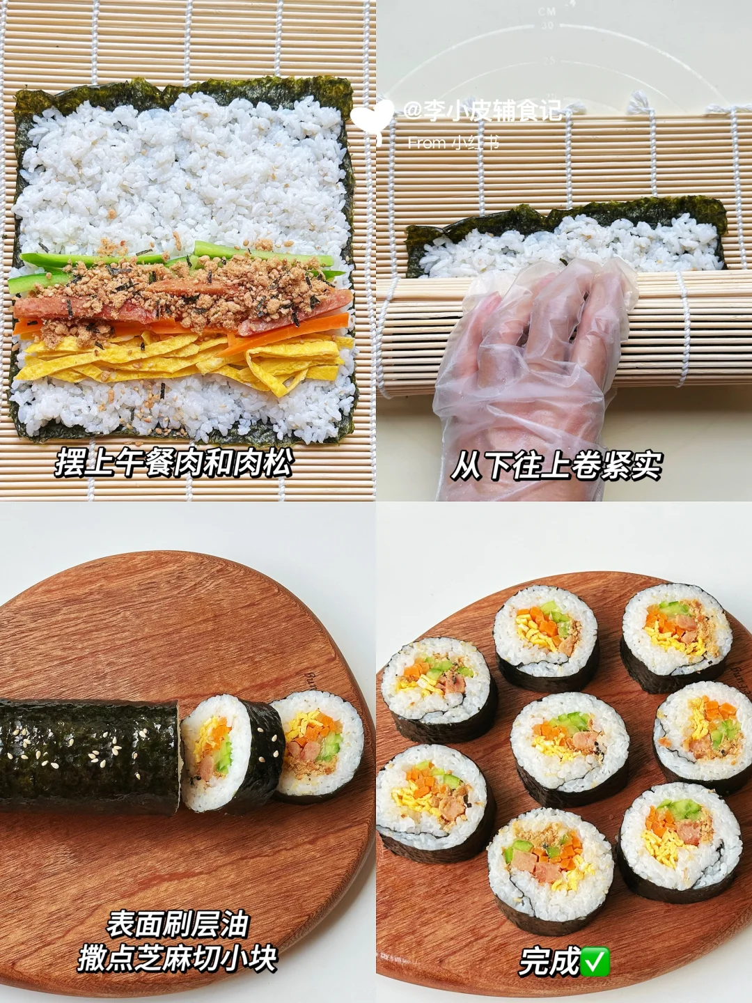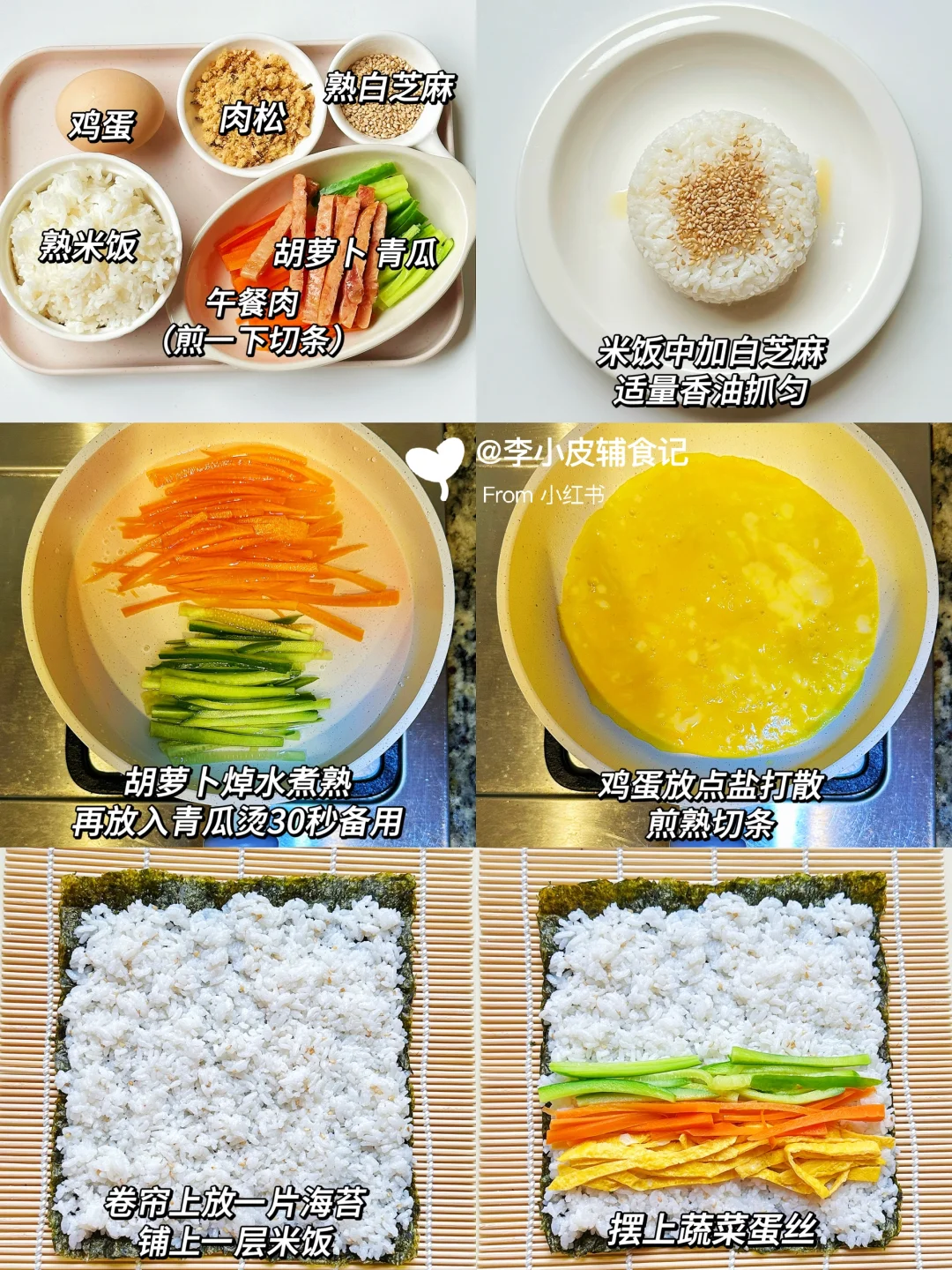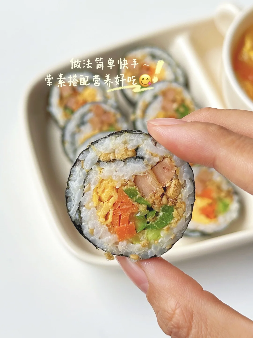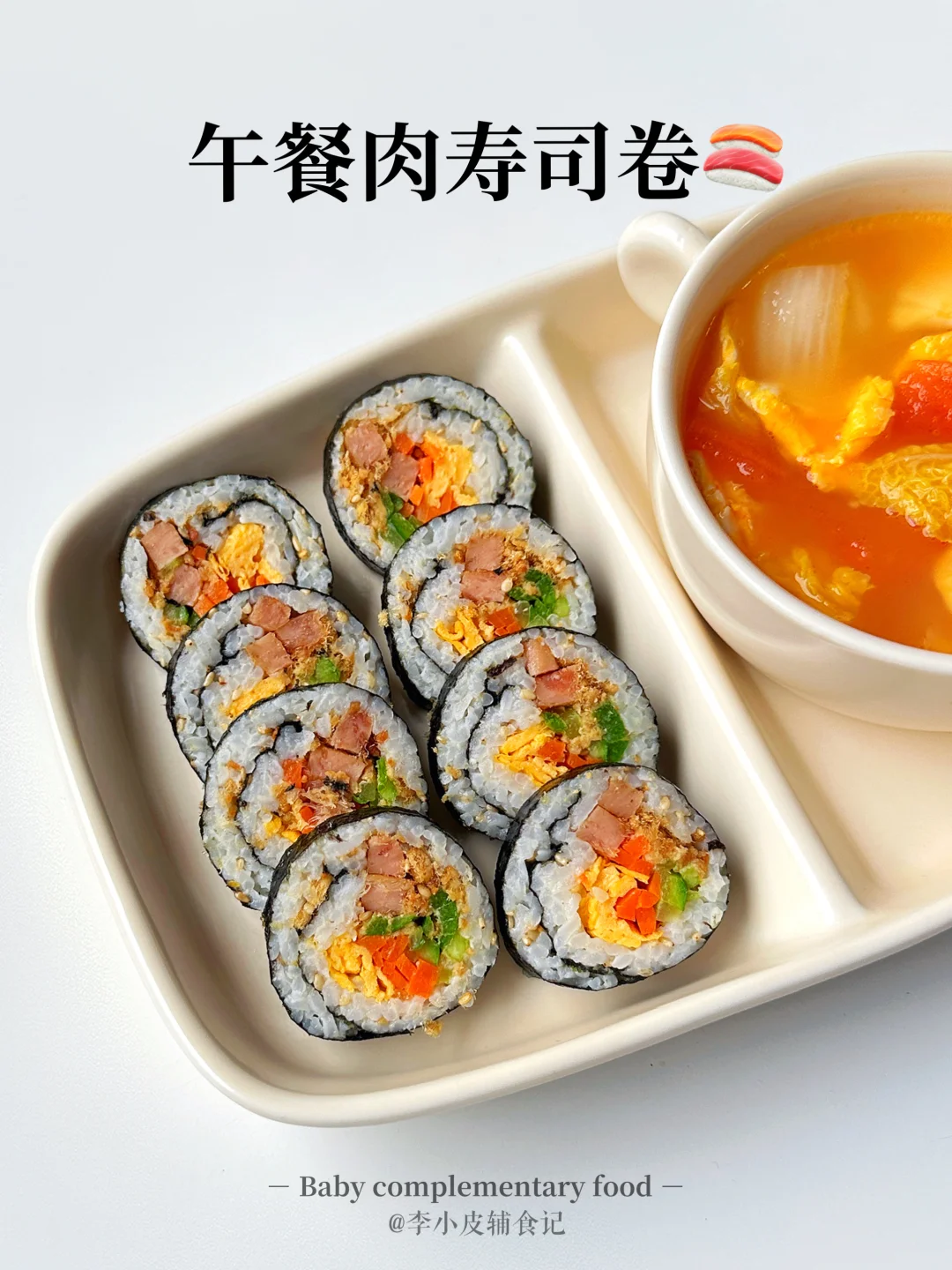 春季养脾胃追高,给宝宝多吃高密度的食物~ 荤素搭配的寿司卷,做法简单,喜欢什么配菜就放什么,卷一卷就能开动,太适合我这种懒人妈妈了[大笑R]!!再搭配上一碗酸甜开胃的番茄娃娃菜汤,开启元气满满的一天~[派对R] - 📝食材 午餐肉寿司卷:熟米饭、鸡蛋、肉松、胡萝卜、青瓜、午餐肉 番茄娃娃菜汤:番茄、鸡蛋、娃娃菜 - 🌟具体操作步骤参考图片哦~ 👩🏻🍳食材大小和分量根据宝宝的咀嚼能力和实际情况来处理喔~