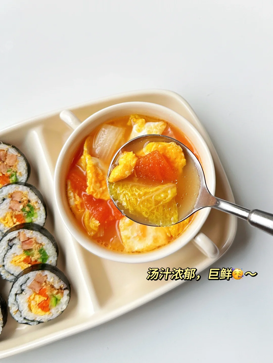 小朋友早餐‼️午餐肉寿司卷|番茄娃娃菜汤