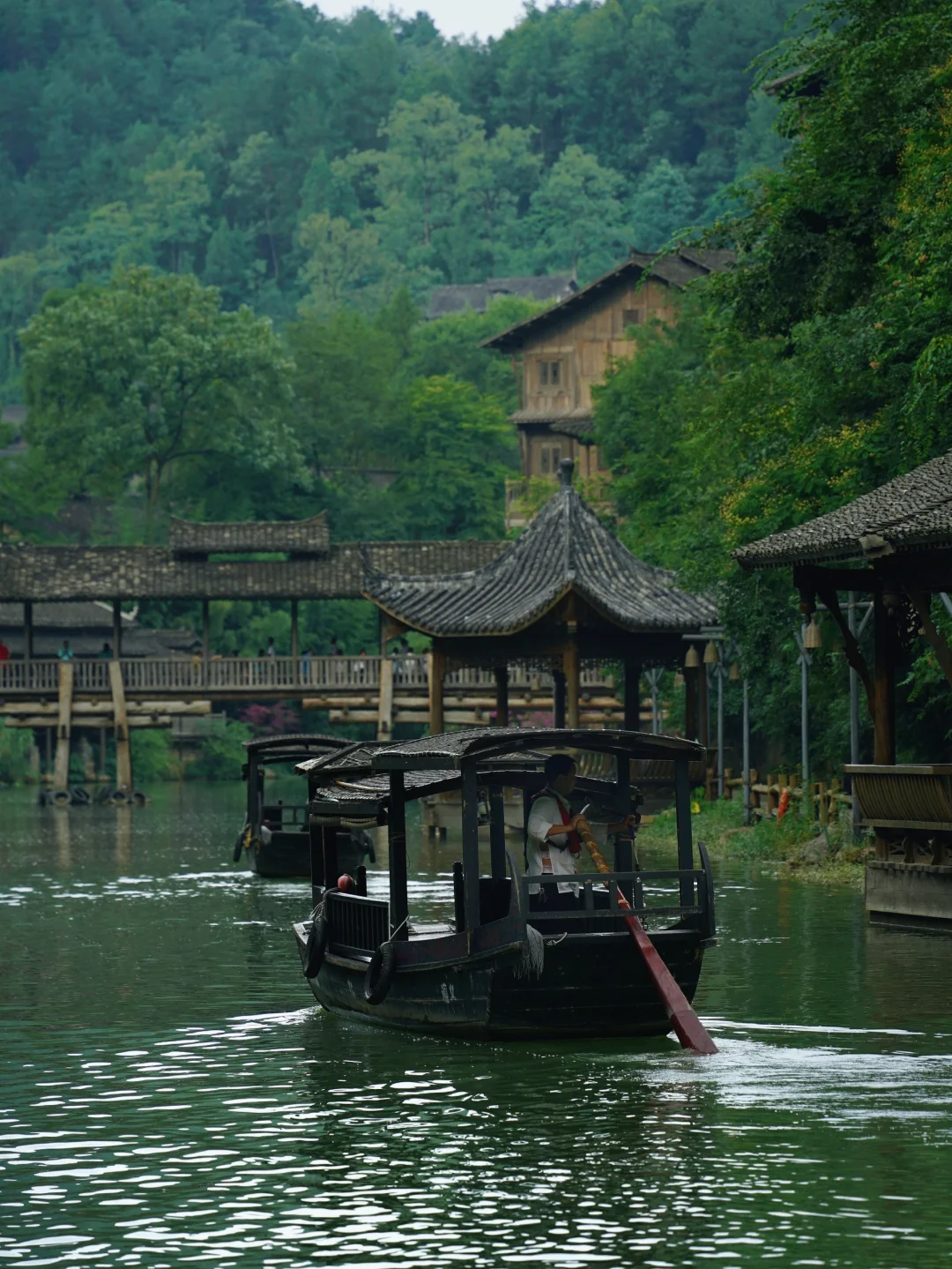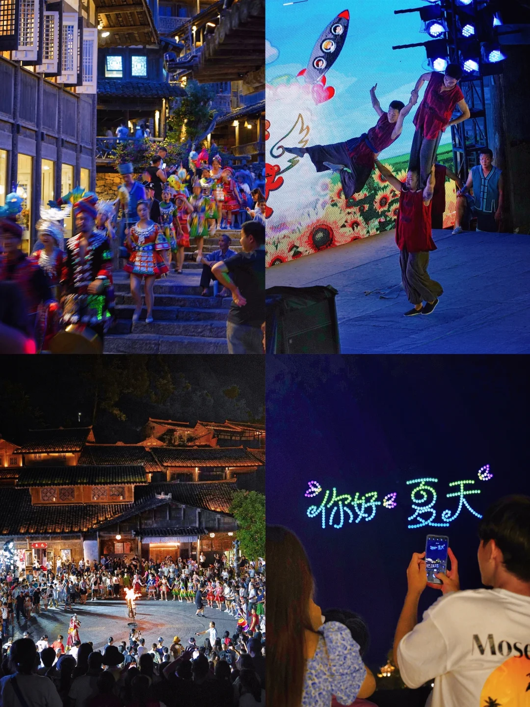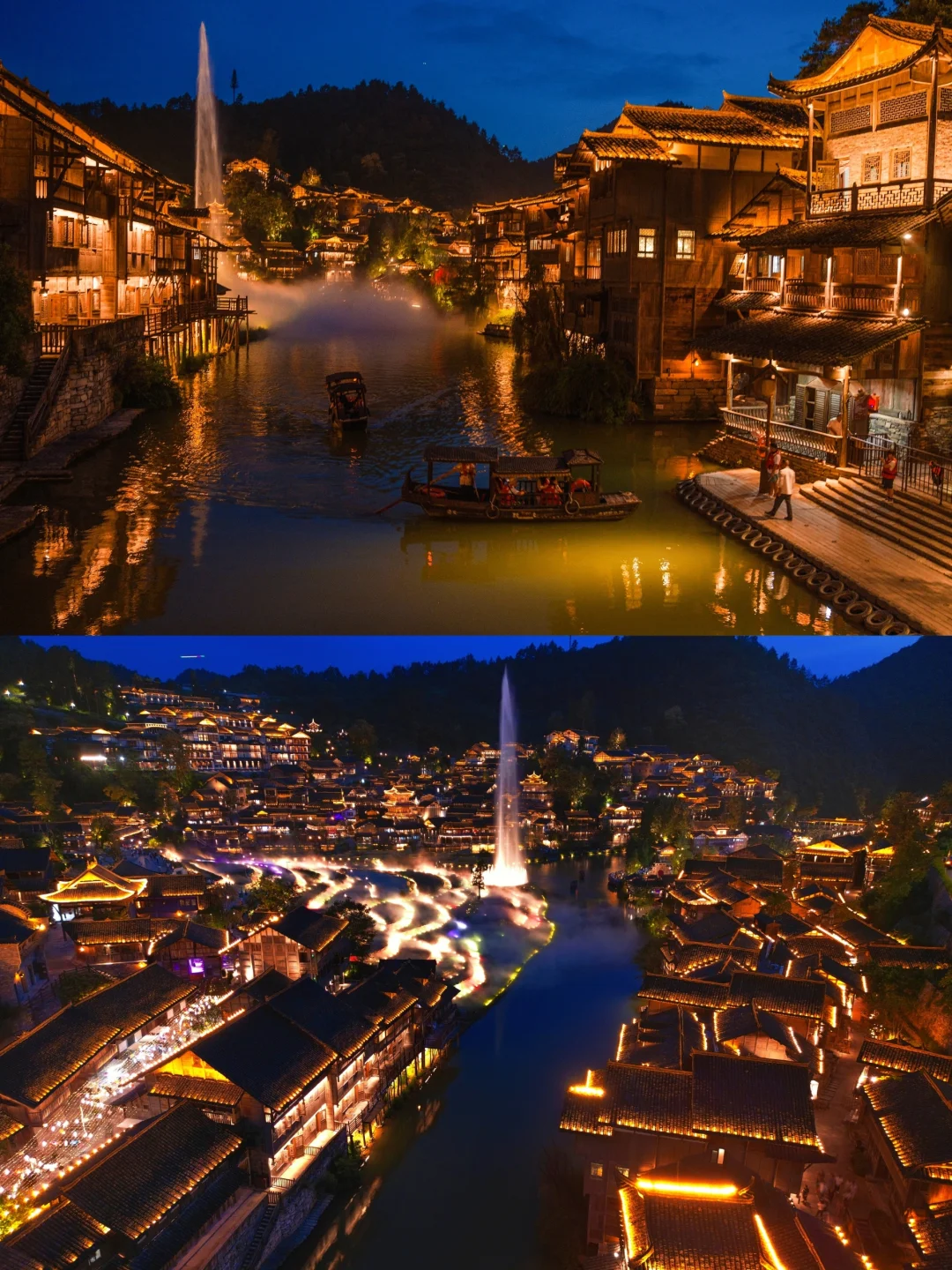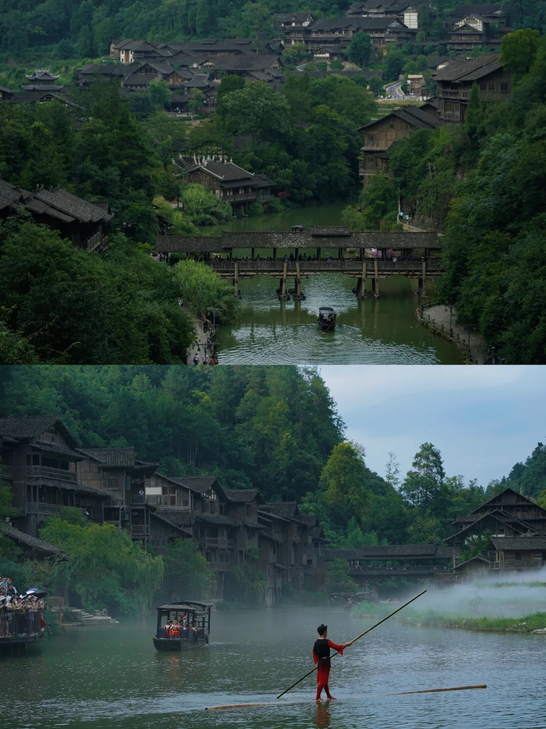 如果这个夏天只能去一个避暑圣地,我一定会选贵州~一个平均温度20℃多度的地方。 但去过贵州N次,却第一次去乌江寨, 呆了2天根本不想走了。第一天晴天温度26℃,第二天阴雨天19℃😍。我真的大爱,特别是阴雨天时敲舒服~ - 它隐藏在山涧里,白天穿上苗服,体验一场少数民族的风情。 当夜幕降临,万家灯火骤然亮起,摇橹船从家家户户行驶过,那景色真的超绝😍 - 📍地址:贵州省遵义市乌江寨旅游度假区西寨口 - ✅关于游玩 🔸早上睡到自然醒,在酒店吃个丰富的早餐,或者有兴致也能租套苗服去码头乘摇橹船,来个贵州独一份的游船早餐,边享用早餐边观赏两岸风景,美极了。随后去到炎黄茶馆体验下竹筒清茶,发发呆很惬意~” - ⏰下午以体验手工活为主,像扎染、竹编花灯、通草堆画、抄写经书等等的~ 时间多还能去苗王酒店的无边游池吃一份丰富的漂浮下午茶,欣赏景区的全景。 - 🔸傍晚可以到廻龙岛欣赏黔北绝技——独竹漂,非遗传承绝技,感受全场欢呼。晚餐去体验多元民俗文化的八方宴,边观看8个少数民族的特色表演,边品尝8道民族美食,这一趟值了!结束晚餐后,再回到廻龙岛欣赏震撼人心的音乐水舞秀表演和无人机表演,夜幕下的乌江寨,在这一刻堪称绝美。 - 🔸晚上一定要去码头旁的太乙廊桥看乌江寨的夜景,超美的,可以说天花板级别😍(图1-2)。 沿途夜景很有电视剧的感觉,还有很多美食价格划算。 21:00时别忘了到廻龙岛参加篝火晚会,多个民族载歌载舞的热情,超有氛围感的。 - ‼️注意:进景区一定要记得在前台拍一下节目行程表,有超多节目的,可根据自己的时间自由安排参加。 📍关于怎么去 高铁或者火车抵达遵义南然后打车20分钟(30💰)左右到达乌江寨西寨口。广深高铁6h,飞机2h直达。 - 🏠关于住宿 附近住宿比较少,建议住景区里面,大概是600-800之间。包含了双人门票🎫+早餐+划船+特殊饮品等等的。 - 如果还有还有什么问题,记得评论区告诉我吧 我是浩然 我们下期见 拜~ -