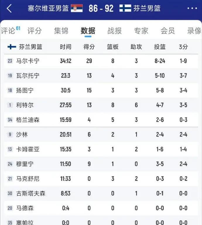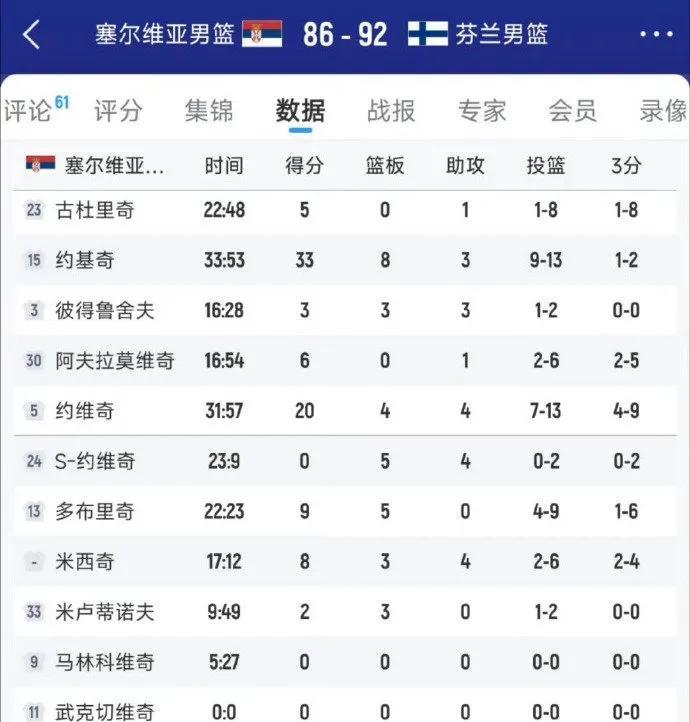 欧锦赛八强赛爆冷!塞尔维亚86-92惜败芬兰无缘晋级,联盟第一中锋约基奇虽独砍33分8篮板奋力carry,队友约维奇亦贡献20分,仍难敌芬兰核心马尔卡宁29分8篮板4抢断的统治级表现。#塞尔维亚队#