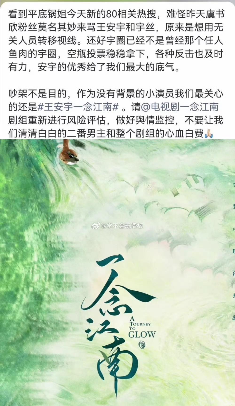 大事不妙!瓜主爆料称,《一念江南》正常开拍,但虞书欣先拍。与此同时,男主角王安宇尚未确定,仍待定。 网友纷纷表示,应该换掉男主角,并建议王安宇尽早退出。 有不少王安宇的粉丝呼吁剧组重新评估风险,做好舆情监控。他们担心,若因为虞书欣的负面新闻影响了剧组,王安宇以及整个剧组的努力将白费。 这剧必须要拍吗[吃瓜群众] #虞书欣# #王安宇# #一念江南#