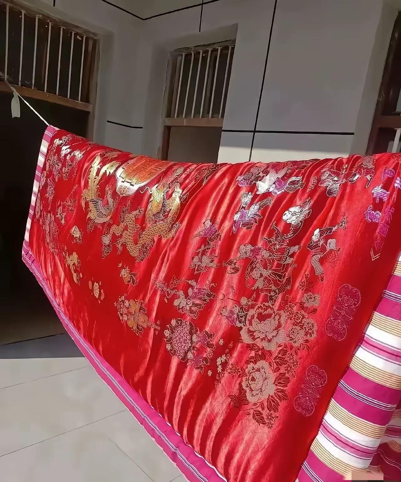 这样的被子,你们家现在还有吗?说实话,十几20年前这样的被子,特别的流行这种抽纸缎子的面料,很多人都买不起,但是现在时代变了,没有人再去盖这种被子了,总感觉盖着脚突然碰到会被扎一下。你们有没有这样的的感觉?现在人们都有那种棉布的布料,柔柔软软的,也不刺脚。
