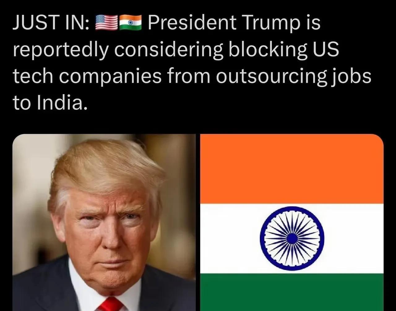 川普总统表示即将禁止美国科技公司购买印度外包服务。川普对印度的狠已经开始向具体措