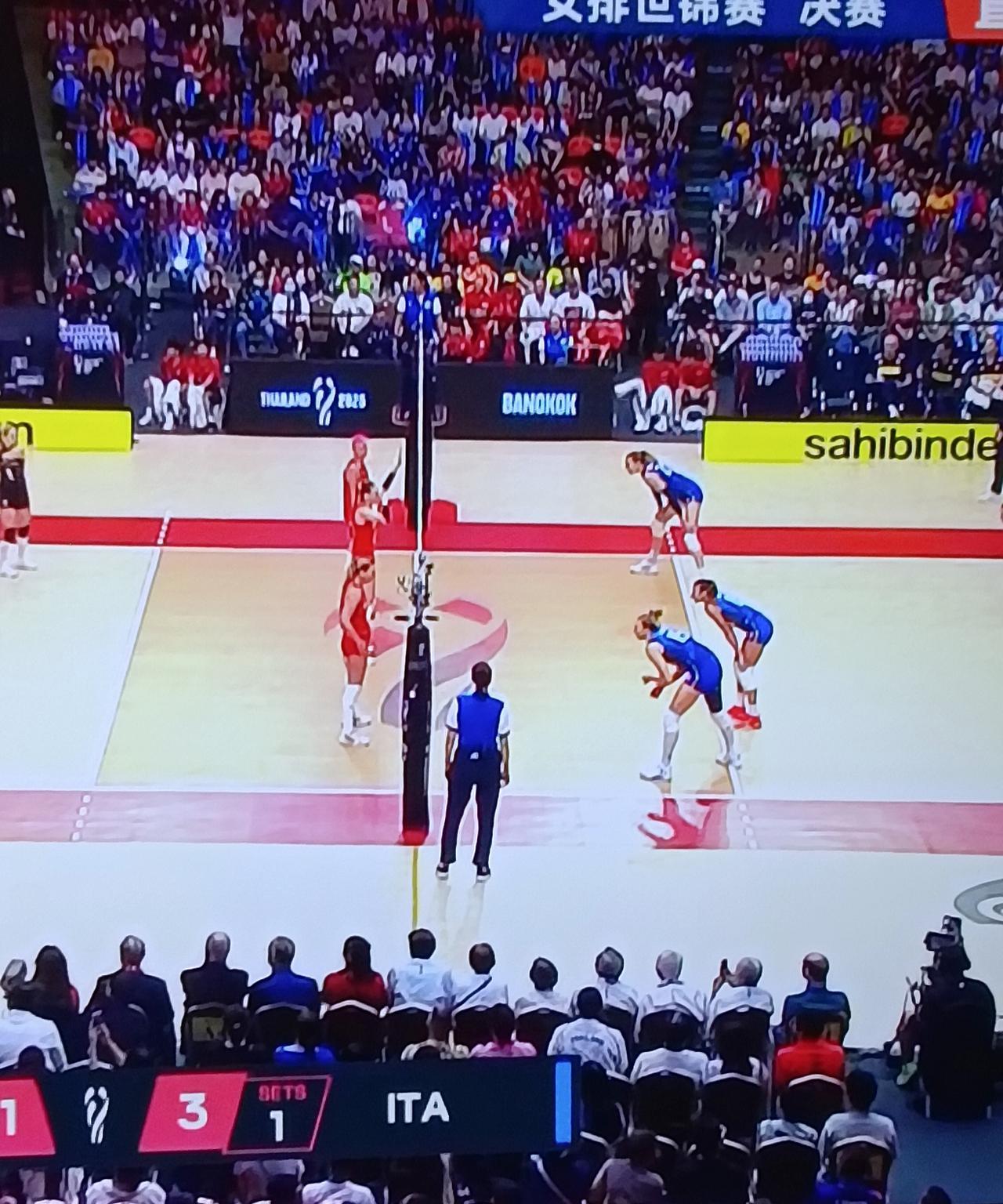 惊险,惊奇,意大利3:2战胜土耳其,荣登冠军。 意大利先拔头筹。一开局就火星四射,双方攻守转换极佳,比分一直胶着。打到局末,意大利抓住两次机会,夺得主动,最后以25:23赢得首局。 土耳其卷土重来。第二局土耳其信心满满,意大利有些准备不足,被打了一个11:3。打到中局,意大利依旧没有找到节奏,继续被土耳其压制16:7,意大利这一局看来是无力回天了。25:13土耳其强势扳回一局。 意大利守住了胜果。第三局,意大利一上来就给了一个下马威,6:2开局。土耳其也不是吃素的,到局中追到14:15,意大利会不会虎头蛇尾呢?19:20意大利还能撑不住吗?意大利三个局点被抹平,再拿局点,艾格鲁发球直得,26:24,意大利站上了制高点。 土耳其没有了退路。第四局,土耳其8:5开局,12:7扩大比分,土耳其有些势如破竹20:12,意大利起势了,只差3分,土耳其没有被冲垮,把比赛拖进决胜局。 2:2,冠军决胜局见分晓。艾格鲁两次失误送分,西拉两扣反超比分,艾格鲁不下球了,意大利4:6落后,追平,反超,9:7意大利重燃希望。土耳其有些迷茫了,15:8意大利冠军。,