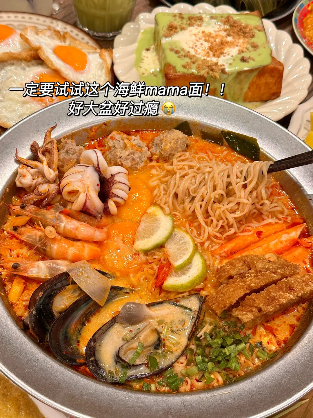 就在地铁B口出来!!种草这家(兰纳小坞)好久了!特意和朋友约着来吃,果然没失望!!第一次吃到斑斓小面包,夹心像冰淇淋一样会爆浆🤤…推荐这个海鲜mama面!酸酸辣辣好开胃 而且海鲜很新鲜 基本上每桌都点了!