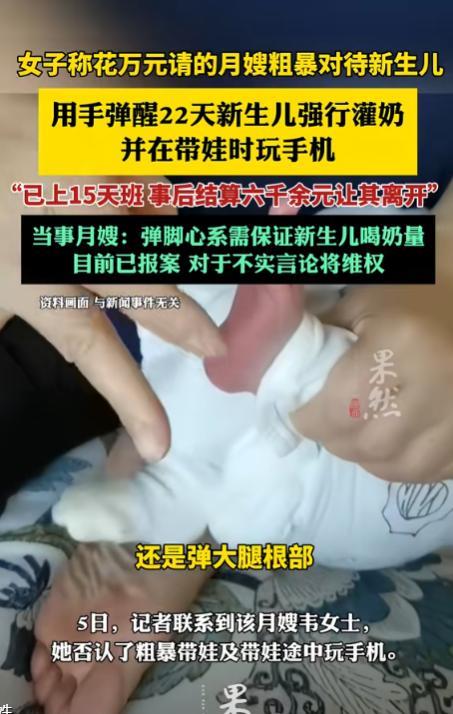 广西柳州,22天的婴儿正在熟睡中,上万元请来的月嫂,竟然用手指弹婴儿的脚心,直到婴儿醒来,她就将奶嘴喂到婴儿嘴中,强行给婴儿喂奶,婴儿母亲恼怒,把干了15天的月嫂给辞了,还结了6000多元的工资,结果月嫂却声称她要维护自己的合法权益。 一名女子找的月嫂,在家带孩子的时候不仅不认真,而且还经常在孩子睡觉的时候将孩子拍打醒进行喂奶,见状女子直接将她告上了法庭。 王女士(化名)怀孕的时候,身边的人都劝她请一个月嫂,但她觉得孩子交给月嫂不放心,就决定自己带孩子没有要找月嫂的打算。 然而就在她刚生完孩子之后,身体非常虚弱自己根本都没办法照顾孩子,于是他就通过手机找到了一个自己觉得还不错的月嫂,月嫂刚来的时候十分专业,对于孩子的照顾无微不至,这时王女士十分放心将孩子交给了月嫂。 然而那天中午王女士在床上休息的时候,突然听见了孩子的哭闹声,于是他就迷迷瞪瞪的睁开了眼睛,不料眼前的这一幕让她十分愤怒。 这时的月嫂盘着腿抱着自己的孩子坐在床上,孩子当时正在睡觉月嫂却为了让孩子吃奶,直接用手弹宝宝的脚心,这时的宝宝还没有醒,于是月嫂就又直接用他的手拉扯宝宝的大腿根,直到孩子醒了之后,她才停止这样的行为。 随后月嫂立马将冲好的奶瓶塞到了宝宝的嘴里,这时宝宝发出了咿呀咿呀的声音,抗拒吃奶,但月嫂不管三七二十一直接就给奶嘴硬塞到了宝宝的嘴里,逼着让孩子喝奶。 看到这一幕的王女士十分的生气,于是就直接喊月嫂,让她停止现在这样的行为,随后月嫂立马解释到说孩子现在还小,如果不每两个小时吃一次奶的话,就会出现低血糖晕的状态,这时的王女士一点都听不进月嫂的解释。 觉得月嫂之所以这么做,就是为了让孩子现在多吃一点,晚上的时候不用打扰他半夜起来喂宝宝,于是王女士就将月嫂辞退了,然后给他结了这15天的工资。 月嫂走了之后,王女士觉得这件事情还不算晚,于是就直接在网上曝光了这名月嫂的所作所为,很快月嫂也刷到了王女士发的这个视频,随后月嫂给王女士发消息说让他删除这条视频,不然她就要通过法律维护自己的合法权益。 那么对于月嫂这种行为,你是否赞同呢?