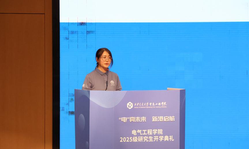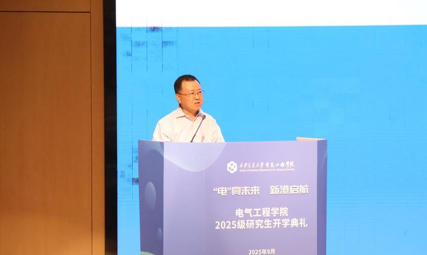 9月6日下午,电气工程学院2025级研究生开学典礼暨新生入学教育隆重举行。来自全国各地的945位电气学院硕士和博士研究生新生齐聚一堂,开启求知求索的新征程。典礼由学院党委副书记宋杰主持。 在庄严的国歌声中,典礼拉开帷幕。全体师生共同感受新时代交大电气人的使命与荣光。 教师代表李金忠教授结合多年在国家电网的工程实践经验,深情寄语新生。研究生阶段是知识深度挖掘的关键期,必须打牢基础、脚踏实地。“电气学院提供的科研资源,是任何企业都无法比拟的平台。” 校友代表西安为光能源科技有限公司创始人、总经理郝翔先生动情回顾在交大求学的点滴。他分享三点感悟:其一,科研必须严谨务实,对每一条公式、每一个数据都要“较真”,容不得半点含糊;其二,坚持自己的研究方向,勇于直面问题,并善于解决问题;其三,要传承西迁精神,把个人理想融入国家发展大局,做勇立潮头的科研先锋。“科研之路注定不会平坦,但只要心怀坚毅,不惧沟壑,终将抵达成功的彼岸。成长为敢突破、敢担当、敢引领的新时代电气人。” 电机教研室2024级博士生王志飞结合个人经历,给出了自己的一些研学建议。他建议新生主动拓宽成长边界,积极参与文体活动与志愿服务,在服务中锤炼能力、涵养情怀。 发电教研室2025级硕士研究生王晓彤同学作为新生代表发言。她以一张1956年西迁专列乘车证为引,讲述自己被“向科学进军,建设大西北”精神感召,毅然选择在交大深造的心路历程。她结合骑行川藏线的经历动情说道:“当看到偏远地区一盏盏亮起的电灯,我更加明白,科研的方向必须与时代同频共振。我们研究的不仅是技术,更是责任——点亮山河,温暖人间。” 校徽是身份的象征,更是精神的传承。典礼举行新生代表佩戴校徽仪式。梁得亮书记为新生代表郑重佩戴西安交通大学校徽。 院长杨旭教授回顾了电气学院从南洋公学电机专科至今的百年发展历程,强调学院始终与国家电力事业同频共振,为国家输送了大批杰出人才。他寄语新生:一要敢于抓住机遇。研究生涯短暂,面对稍纵即逝的机会,要主动出击、奋勇争先,在变革中开辟新局;二要提升核心竞争力。面对科研“内卷”,唯有掌握超越他人的能力与智慧,成为不可替代的“少数”,才能真正破局;三要做出超越个人利益的选择。真正重要的抉择,往往不以个人得失为衡量,而应心怀家国,在服务国家战略中实现人生价值。他勉励同学们在创新港这片沃土上,脚踏实地、志存高远,书写属于新一代电气人的精彩篇章。 典礼尾声,全体师生齐唱校歌《为世界之光》。 典礼结束后,电气工程学院副院长杨飞和校保卫处主管张伯阳为2025级硕士和博士研究生开展新生入学教育。杨飞教授从交大西迁历史讲述学院学科发展,介绍学院的师资队伍、人才培养计划等,帮助同学们更好地了解学院、学科前沿动态,更快熟悉研究生生活的环境。张伯阳老师则通过现实案例教育同学们增强安全防范意识,遵守实验室安全规范,远离电信网络诈骗。