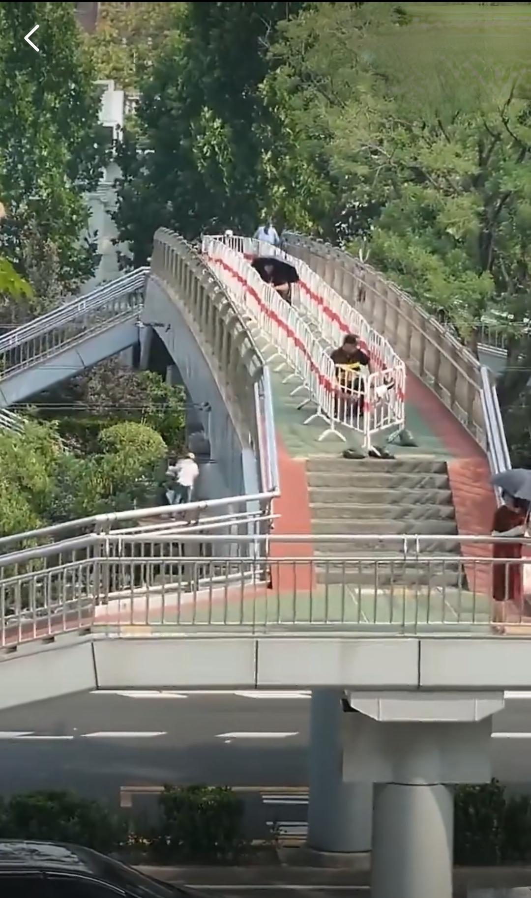 这个步行过街天桥还有推电驴过街的人和打伞的妇女,看起来像是国内的。但也别急着说风凉话。 我个人判断是临时安排的。 这样的情况,我见过两次。一次是在南宁举办马拉松比赛。当时天桥上就有人执勤。担心跑者过来的时候有人扔垃圾。 另外一次是东盟十国开会。为防止恐怖袭击,桥面也有武警。