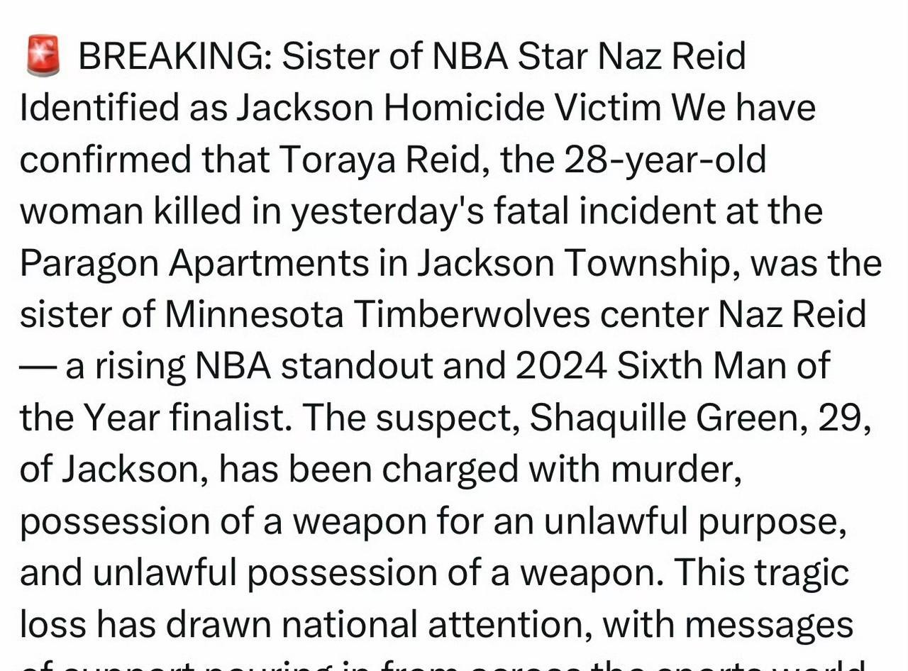 嫌疑人是29岁的沙奎尔·格林,他是里德姐姐的男友,已被指控犯有谋杀罪、非法持有武
