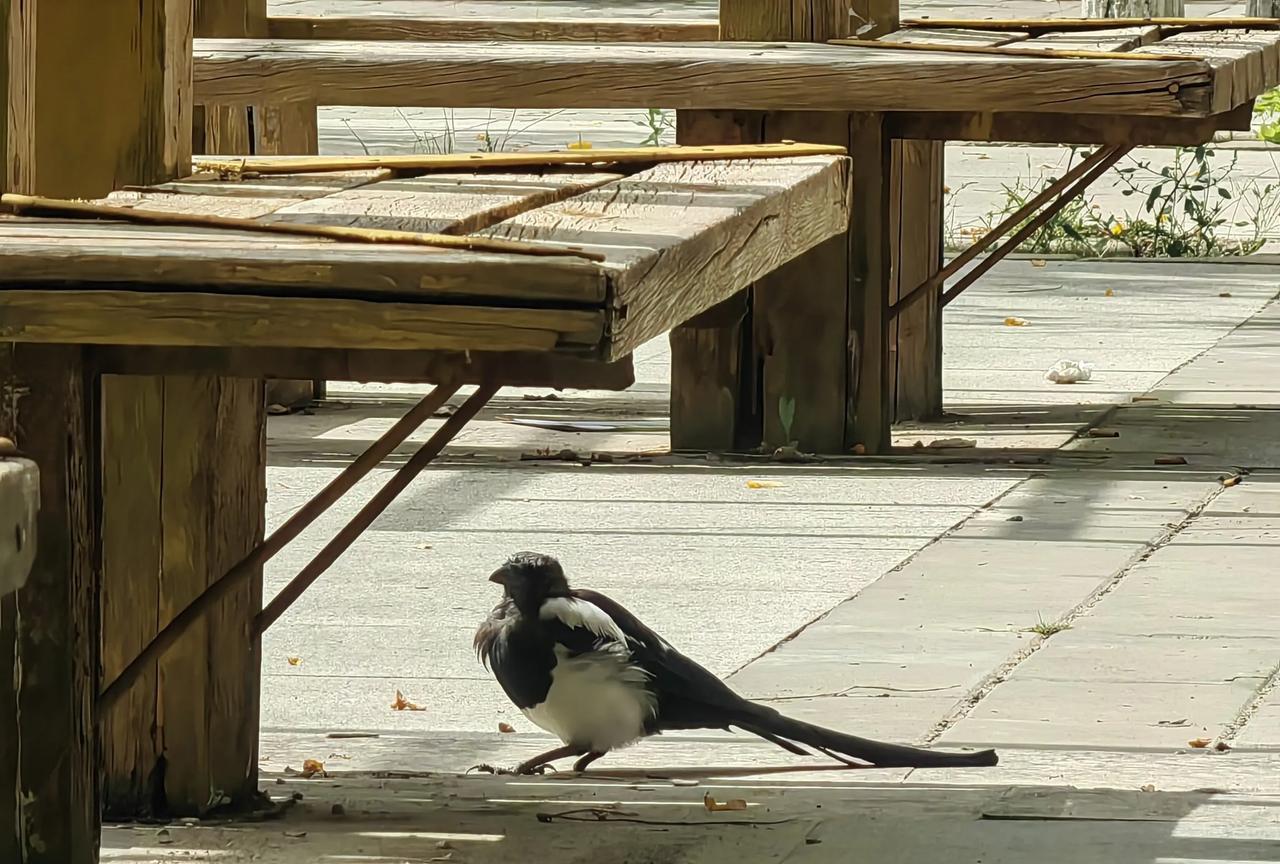 今天在公园看到一只生病的喜鹊,旁边没有同伴,看着怪可怜的。因为喜鹊是群居动物,平