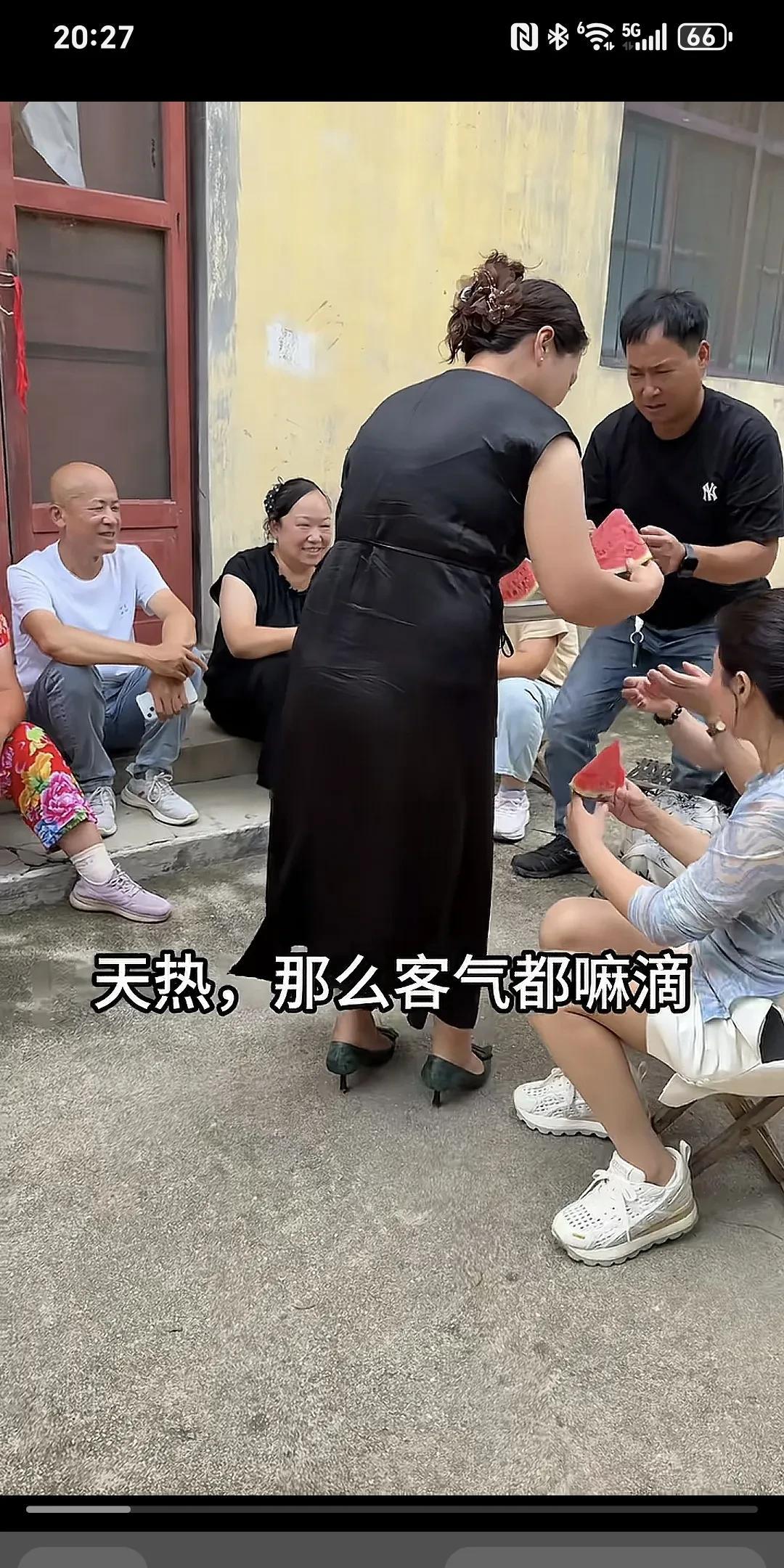 太尴尬了,你都给就不给她,人家还礼貌的站起来了,还说的客套话,笑脸相迎,结果打脸了,笑的肚子疼。 今天怪凉快的,是吧,我觉得今天好多了,这不是得来,来来来吃西瓜来,都那么客气都嘛滴,你看这里聊天还给西瓜吃,你看俺来玩还那么客气,刚摘的新西瓜,刚摘的,白衣女子看都发完就剩一块了,主动站起来到拿,没想到端正瓜女子自己吃了,大家都说这西瓜真甜真好吃,白衣女子没拿到西瓜很尴尬,不知如何是好,悄悄的过走边安慰自己:“弄了个样都嘛,都跟谁没见过西瓜滴样,我的个乖乖给谁弄个样。” 看着看着就哭了,这就是现实,很多势力眼就是这样。