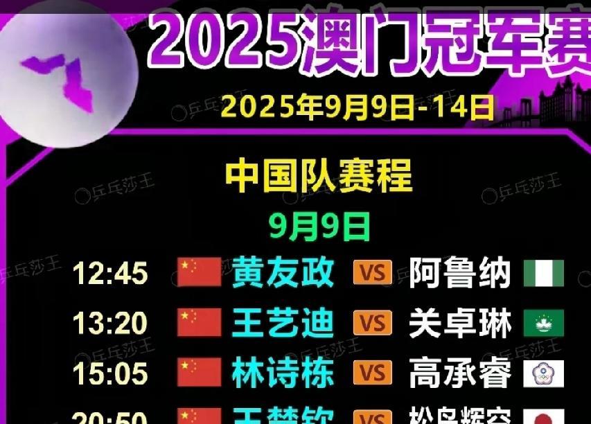 澳门冠军赛! 最早的一场比赛是12.45分,小将黄友好对阵阿鲁纳。 阿鲁纳是非洲尼日利亚选手,出生于1988年,今年37岁了。黄友政和他是首次交手,希望黄友政胜出。 13.20分,是王艺迪和关卓琳的比赛。 卓琳是来自中国澳门的乒乓球运动员,2009年出生,今年才16岁,还是个中学生。这次她是持外卡参加WTT澳门冠军赛的。和王艺迪是首次交锋。期待她们精彩表现。 接下来15.05分,林诗栋对阵高承睿。高承睿是中国台北乒乓球运动员,出生于2024年,目前世界排名24位。林诗栋只要专注比赛,问题不大! 明天我们的乒乓球运动员最后一场比赛是20.50分,由王楚钦对阵日本选手松岛辉空。 松岛辉空最近的比赛是WTT常规挑战赛阿拉木图站,在男单1/4决赛中1-3不敌周启豪,无缘四强。这场比赛王楚钦胜率很大。 澳门冠军赛这就开赛了,好戏连连,精彩不断! 在这里祝福我们每位运动员都快乐参赛,健康完赛!