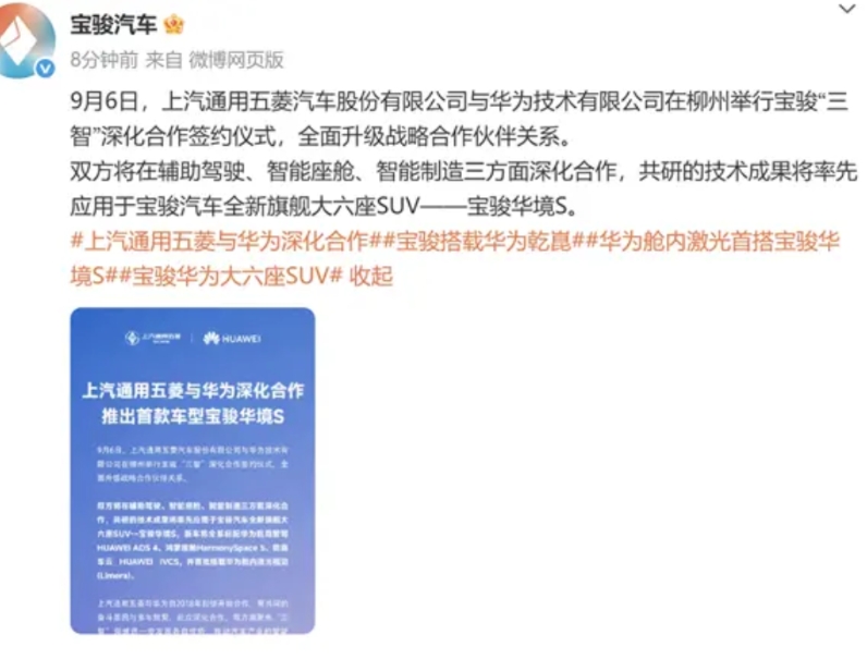 最便宜的华为系车型来了,宝骏华境S,满血版华为智能系统。 9月6日宝骏与华为在柳州签约,在智能驾驶、智能座舱、智能制造方面全面合作。 首款车型宝骏华境S,定位15万级,预计年内上市,全面搭载华为乾崑智驾ads4.0,鸿蒙座舱5,乾崑车云,激光雷达等。 上汽旗下已有上汽(尚界)、上汽奥迪与华为合作,并已推出车型尚界H5、上汽奥迪A5L,宝骏的加入可能再创神车奇迹。 大家觉得宝骏华境S平民化智驾能否成为爆款神车?