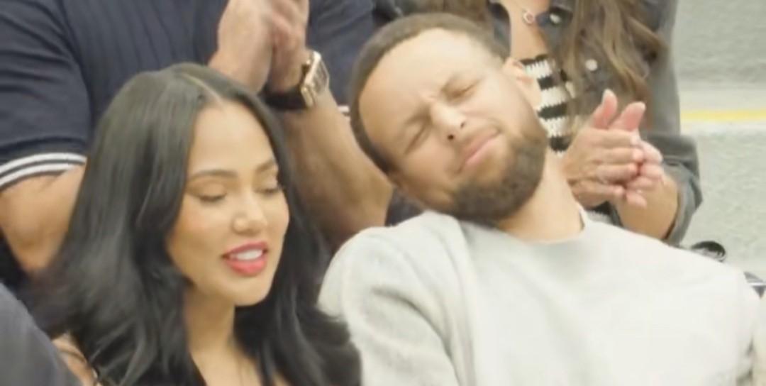 库里明显很不高兴,因为他看不上的特朗普来看球导致枯坐一小时。 库里跟妻子阿耶莎一