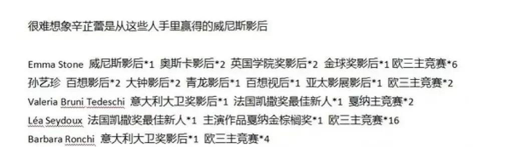 辛芷蕾这次拿奖的含金量有多高,神仙打架下的全票通过! 威尼斯电影节与戛纳、柏林并称“世界三大国际电影节”,其表演奖项代表全球电影艺术的最高水准,含金量仅次于奥斯卡。辛芷蕾是继巩俐(1992年《秋菊打官司》)、叶德娴(2011年《桃姐》)后第三位华人威尼斯影后,终结了华语女演员近14年无缘欧洲三大电影节影后的空白,也进一步扩大了中国演员的国际影响力。 “我想对所有的女孩说一声:只要有梦想,就大胆去想、大胆去做,万一哪天就实现了呢,像我一样。大家好,我是国际巨星辛芷蕾。” 好自信好耀眼!中国内地籍演员就她一个人得了这奖,厉害,演员全球最高奖项之一!