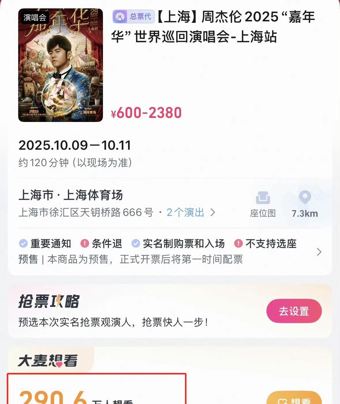 周杰伦上海演唱会今晚19点开票!290万人蹲守,连演3天还联动上海旅游节 周杰伦2025“嘉年华”世界巡回演唱会上海站今晚(9月8日)19:00正式开票!本次演唱会将于10月9日至11日连续三晚19:00,在上海体育场开唱。 据大麦网数据显示,目前已有290.6万人标记“想看”,开票前热度持续飙升。 值得一提的是,上海旅游节还将同步推出“乐游上海 寻找周同学”线上线下全场景活动,为观演歌迷打造更丰富的游玩体验。 #上海热门演唱会# (资料来源:乐游上海、大麦网)