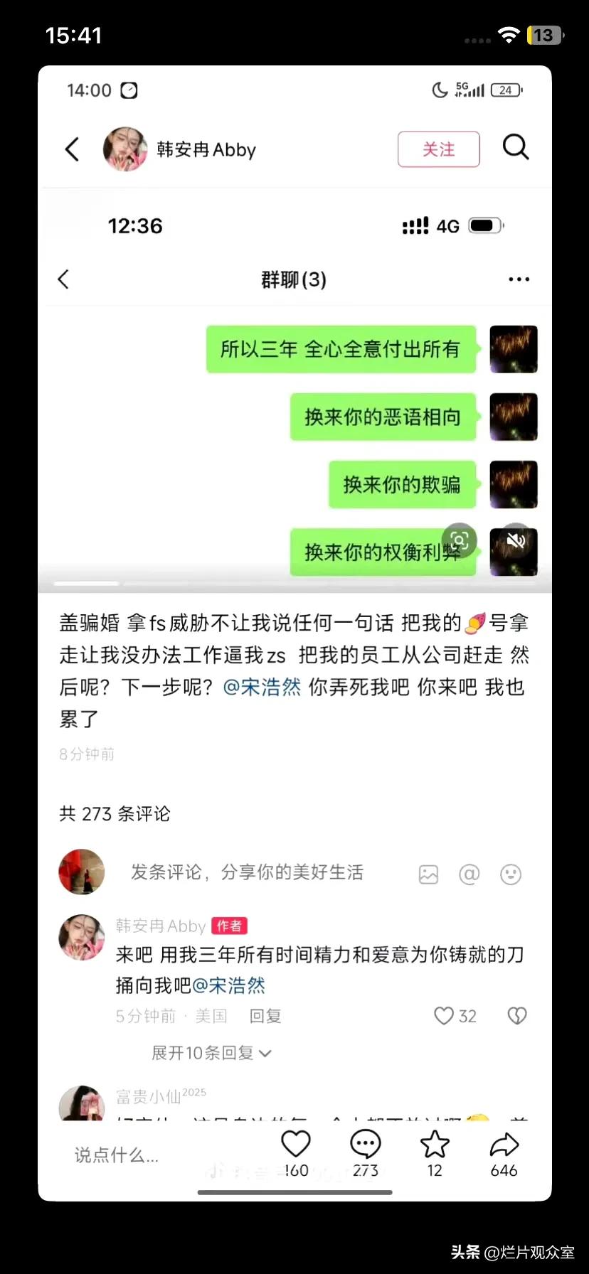 韩安冉发了和宋浩然的聊天截图,对方让她不要直播说他,也不要拿小孩来绑架他…… 话说他们不是在怀三胎吗?怎么又要离婚,不会是为了直播热度吧,好卖货吧。毕竟之前一直说没钱了[捂脸] 我还是太老实了,怪不得成不了网红[打脸] 韩安冉感情 宋浩然