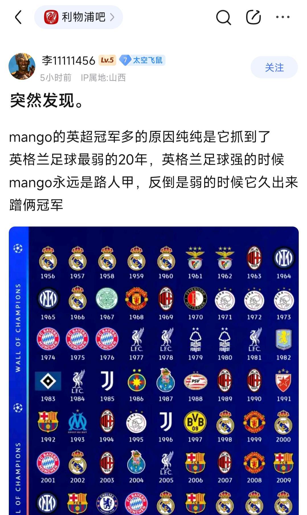 直到现在曼联球迷和利物浦球迷,还在隔空对骂! 曼联球迷说,有一名球员(杰拉德),没有英超冠军,还入选英超名人堂?还称之英超第一豪门? 利物浦球迷说,曼联英超冠军多,那是英格兰足球最弱的年代,英超强大曼联就不行了。 我来公平的说,杰拉德没有英超,但是贵在一生效力一支球队,那会就是利物浦代表,利物浦又是豪门就是他啦。 然后90年代的英超为什么弱?利物浦要负责! 1985年欧冠决赛,利物浦球迷和尤文图斯球迷冲突,此次造成38位尤文球迷丧生。 欧足联震怒,禁止利物浦7年,所有英格兰球队5年不得参加任何欧洲赛事。 此后英格兰联赛水平大幅度掉队,一直到2005年之后,切尔西的金元足球来了才恢复。 这才是正确的足球历史呀!![叹气]