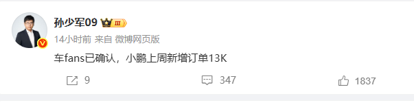 孙少军: 车fans已确认,小鹏上周新增订单13K !