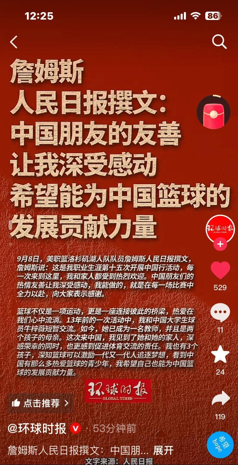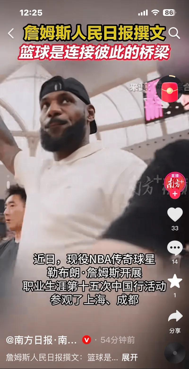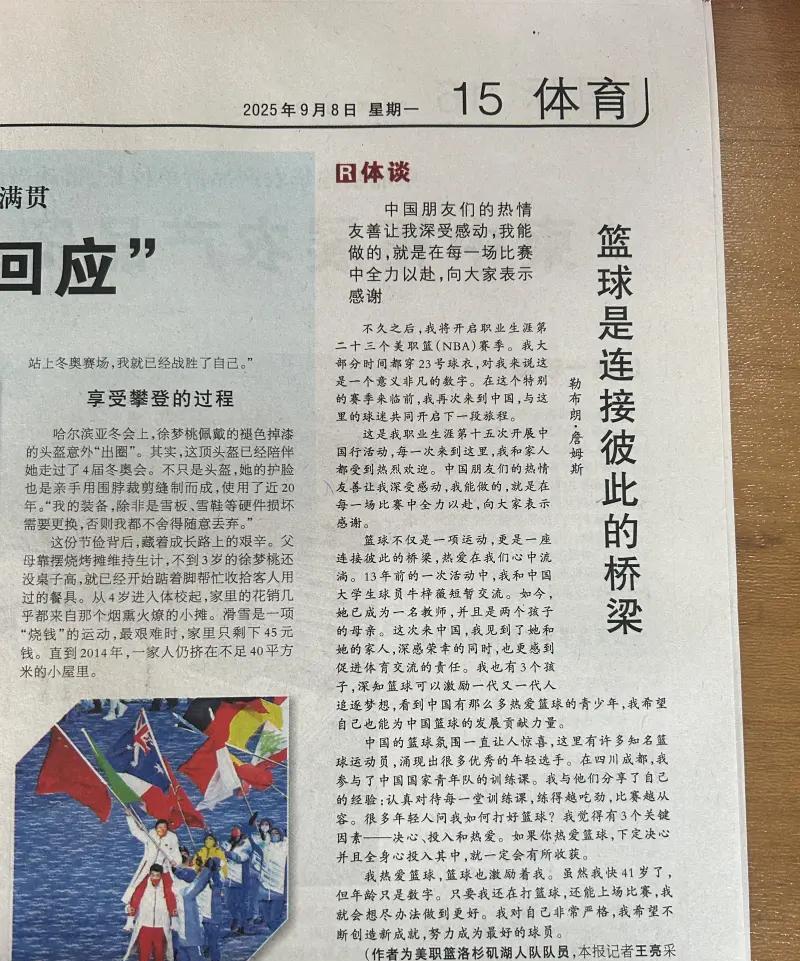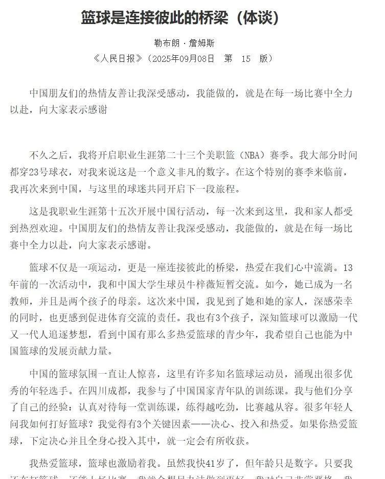 排面!詹姆斯中国行时接受《人民日报》采访,同时刊登了发布了文章《篮球是连接彼此的