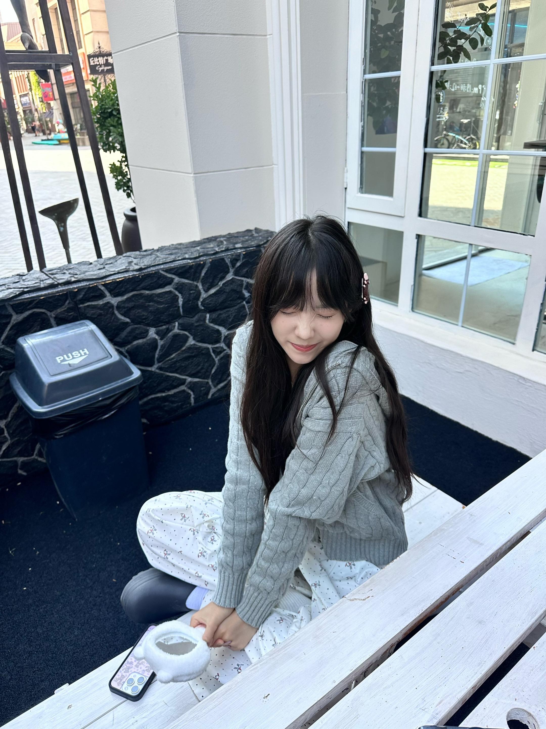 一位长相漂亮、身材出众的姑娘,穿上了一件对身材要求极高的紧身款一字肩粉色针织衫搭