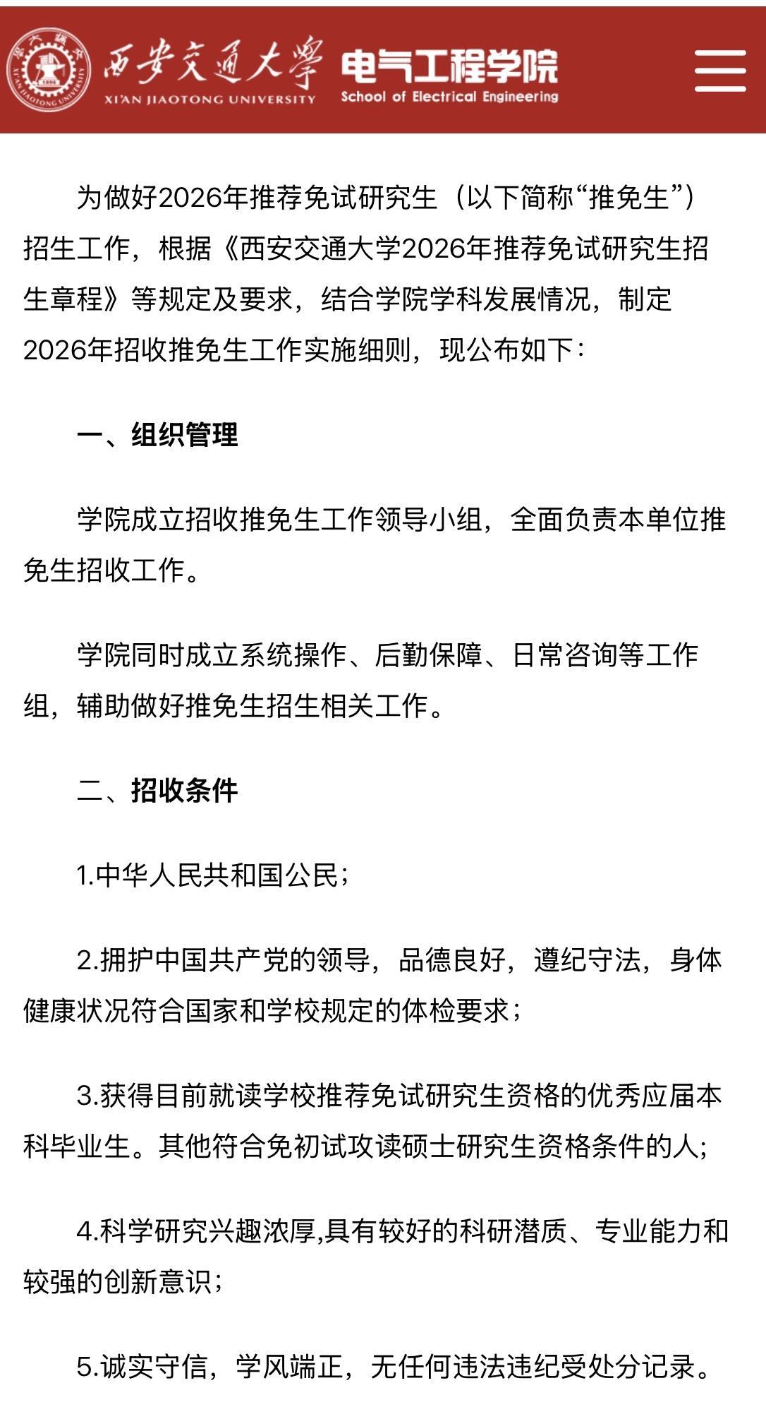 西安交通大学推免已全面启动,各学院也公布了实施细则。与学校大同小异。因为学校在9月15日前已通过学校推免服务系统完成了流程,全国推免管理服务系统报名后开通,要求考生马上报名,马上发录取通知,2小时内确认。按照一流大学、一流学科、其他优秀生源的顺序,在招收计划范围内分批次录取,额满为止。学校推免服务系统发复试通知也要求2小时之内回复。 电气学院学硕推免198人,专硕169人,直博67人,国优1人(副导师中小学名师,面向中小学就业)工程硕士21人,工程博士17人,推免总名额473人,这么多!推免名额越来越多了!