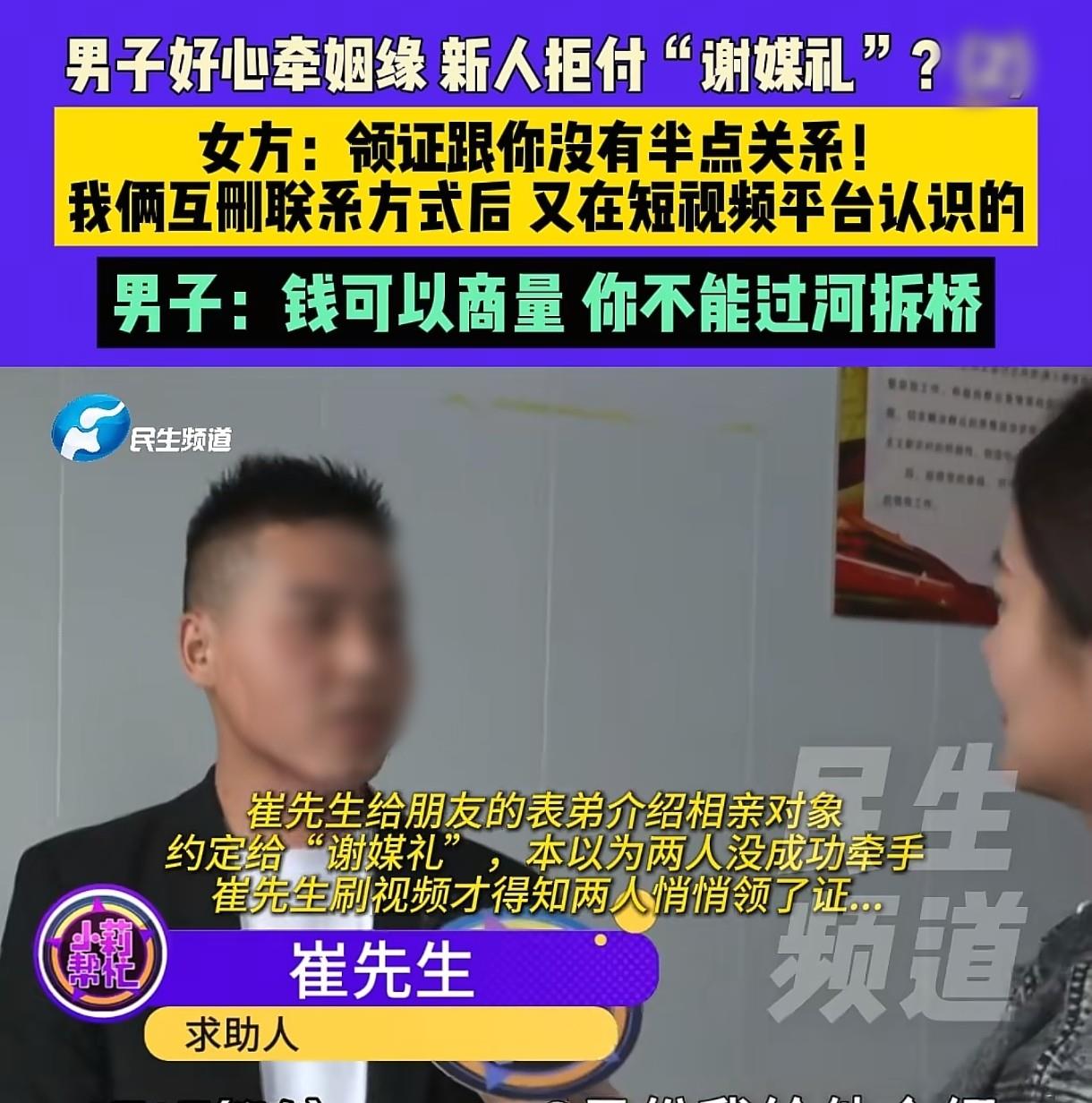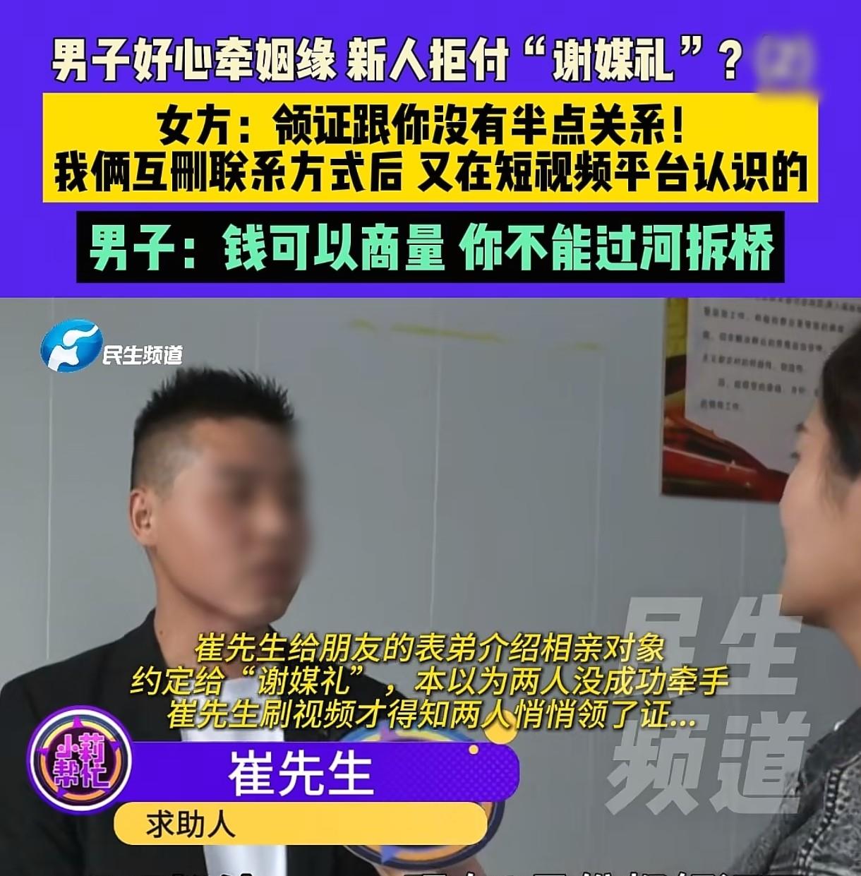河南三门峡,男子得知朋友表弟40岁了还没媳妇,给他介绍了一名女子,5个月过去,两人都没信,男子以为这事没成,又给对方介绍了一个姑娘,对方也答应了。可没想到,男子无意间刷到,朋友表弟和之前的女子已经领证结婚了,他联系对方,要求对方给6000元谢媒礼,可对方却说:结婚证领了跟你没半点关系,你跟我们说的压根没成,我们自己刷视频联系上的。 崔先生是从事婚庆工作的,平时也做些说媒的业务。 2025年3月,他得知朋友的表弟40岁了,还没有媳妇,也没有结过婚,家里人都急坏了,四处托人帮忙介绍对象。 他找到了一个合适的人选,女方41岁,离异带着2个孩子,是卖红薯面条的,而男方是个面点师,他觉得两人的条件还算匹配,就兴冲冲带着男方去跟女子见了面。 同时,他跟朋友说好了,让朋友表弟先交299元的会员,如果两人成了,订婚后给2999元,两人领证结婚之后再给2999元的介绍费。 见面之后,崔先生一直等着男方和女方的好消息,可左等右等,都没有等到信儿,他以为两人看上对眼,没成,于是,他又马不停蹄的给朋友表弟介绍了另外一个人,对方也答应了。 可8月25日上午,崔先生闲来无事刷短视频,无意间刷到了男方和女方领了结婚证的视频,他开心坏了,急忙跟对方发去了贺喜的信息,对方没回。 他又给男方打电话,可对方始终不接,崔先生傻眼了,对方明显是不想给钱了。 崔先生又联系了男方的表姐,想问问男方在县城的家到底住哪儿,可男方表姐却说自己也不知道表弟家具体在哪儿,她自己也没去过。 对于朋友的说法,崔先生一个字都不信,实在没办法,他只好找来了记者,一起前往男方所在的村子,在村里的帮助下,他们终于联系上了对方。 男子媳妇承认崔先生确实给他们引路了,可崔先生给他们介绍的时候,他们压根就没成,见面没几天就把联系方式给删了,两人是3个月后,在网络上刷到对方,才重新认识见面的,他们领证跟崔先生没半点关系。 崔先生也急了:你俩不是通过我,你俩咋认识的,你说吧!你俩删没删自己心里都知道。 他指责对方过河拆迁,忘恩负义,如果没有自己,他们也不能持证上岗。 男子媳妇却说:你说让我们少给点可以,但6000块钱绝对不可能给。 经过一番协商,两人最终转了2000元给崔先生。 给人介绍对象,收取费用合理吗? 崔先生作为媒人,与男方表姐达成了口头约定,明确了收费的标准和条件,这实际上形成了一种居间合同关系。 居间合同是指居间人向委托人报告订立合同的机会或者提供订立合同的媒介服务,委托人支付报酬的合同。 《民法典》第963条规定:中介人促成合同成立的,委托人应当按照约定支付报酬。 崔先生为男方和女方提供了相识的机会,完成了居间合同中的部分义务,尽管女方解释说崔先生给他们介绍时,两人没成,两人后来是在网络上认识的,见面后才发现是彼此,可这个说法让人难以信服。 媒人收取的介绍费应当是事先与委托人约定的,并且费用应当合理,不得过高或存在不公平的情况,并且要避免利用媒人身份进行欺诈、勒索等非法行为。 在这个事件中,崔先生带男子去跟女方见面时,有跟男子表姐说了自己会收取介绍费,如果男子家当时有异议,应当提出来。 男子和女子通过崔先生的介绍,认识后并领取了结婚证,支付一定的费用给崔先生也是正常的,但是这笔费用需要合理,且需要遵循公平原则。 《民法典》第6条规定:民事主体从事民事活动,应当遵循公平原则。 如果服务与收费严重不对等,明显超出合理限度,则可能构成不当得利。 《民法典》第1042条规定:禁止借婚姻索取财物。 给人介绍对象,可以收取合理的费用,但是不能狮子大张口,借婚姻索取财物。 有人觉得崔先生收取对方299+2999+2999+6297元的介绍费很合理,比起那种动不动上万元的已经很良心了,既然是说好的费用,就要给,躲着别人、不接电话就不合适了。 但是也有人说既然是朋友的表弟,多少是别人的心意,给多给少都无所谓了,但是一分不给,确实说不过去。 最终对方转了2000元给崔先生,崔先生也觉得钱可以商量,但是新人不能过河拆桥。 对于此事,大家怎么看? 关注 ,从法律角度看世界,感受不一样的人情冷暖。