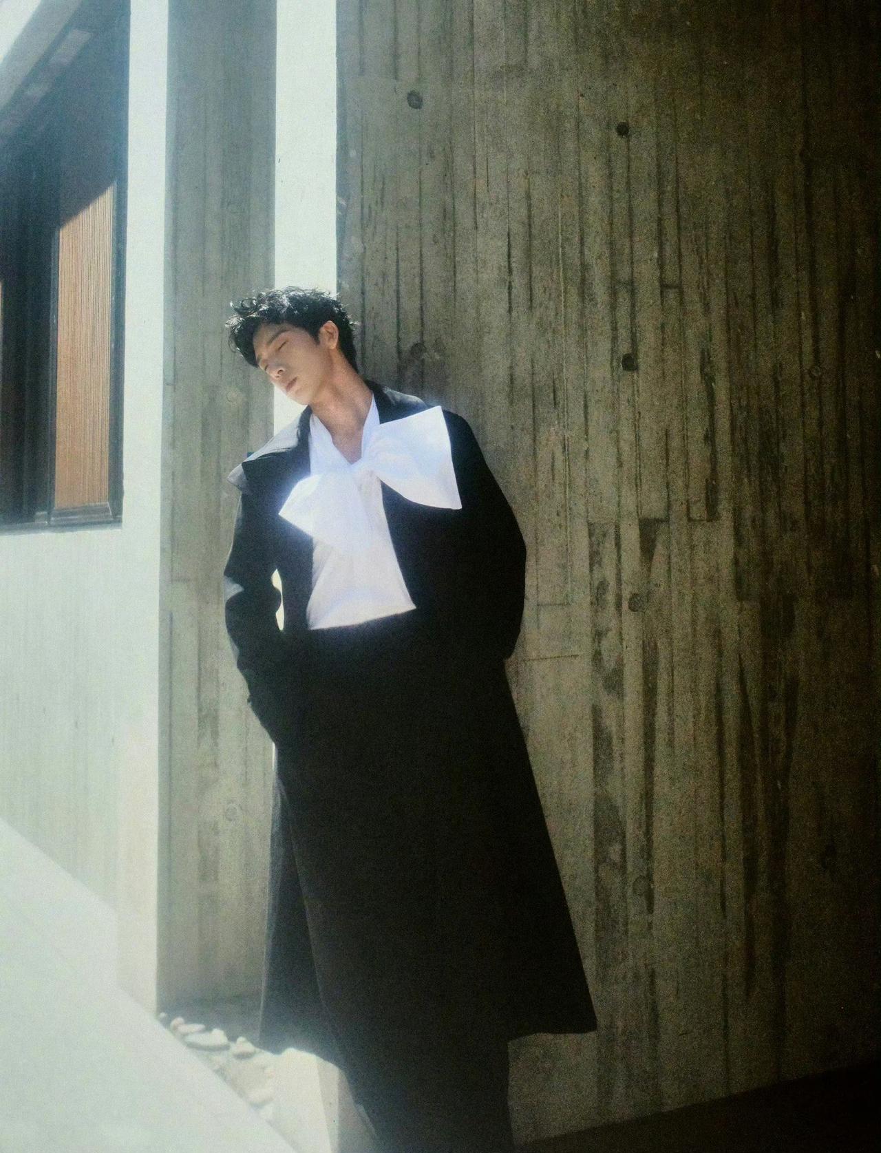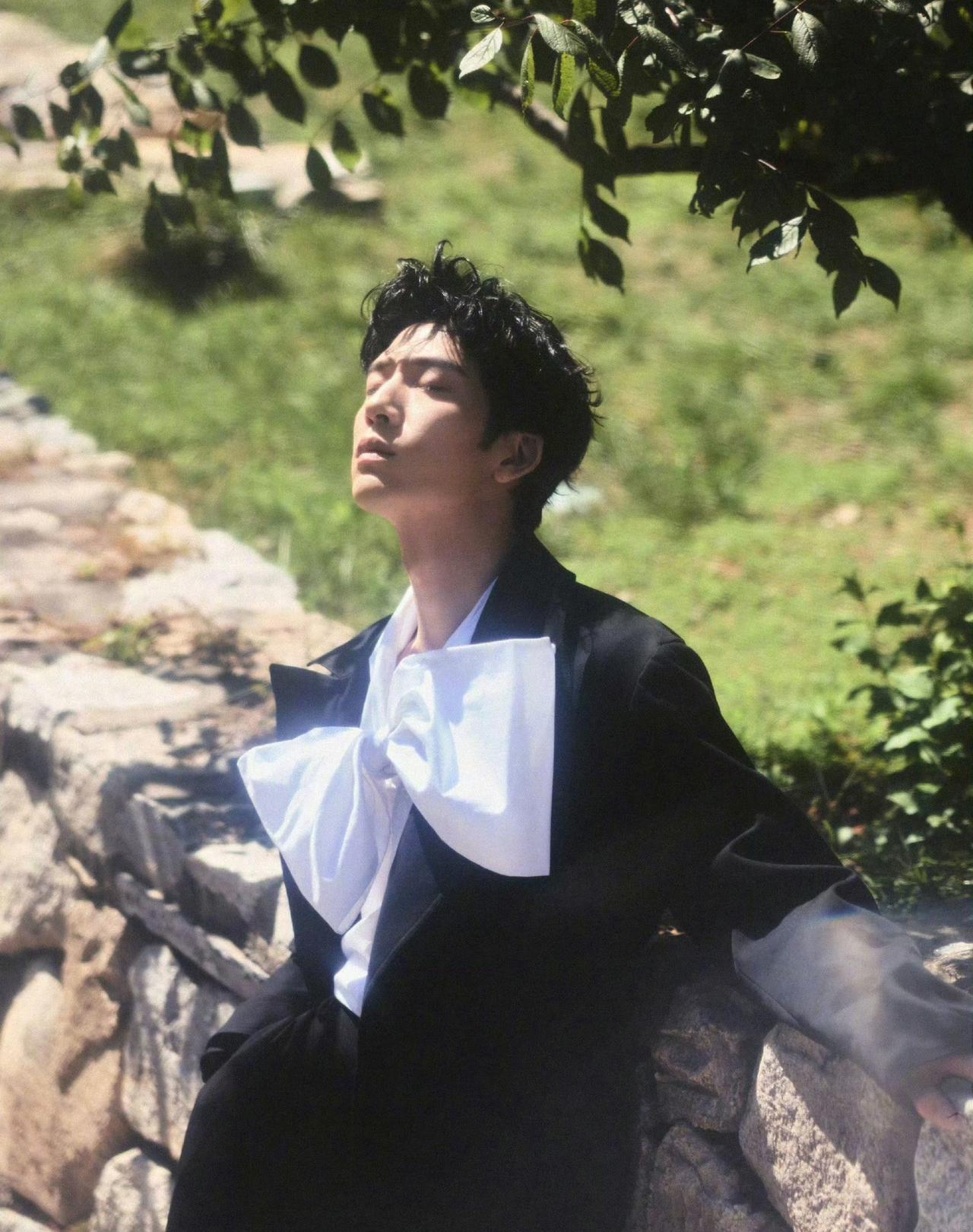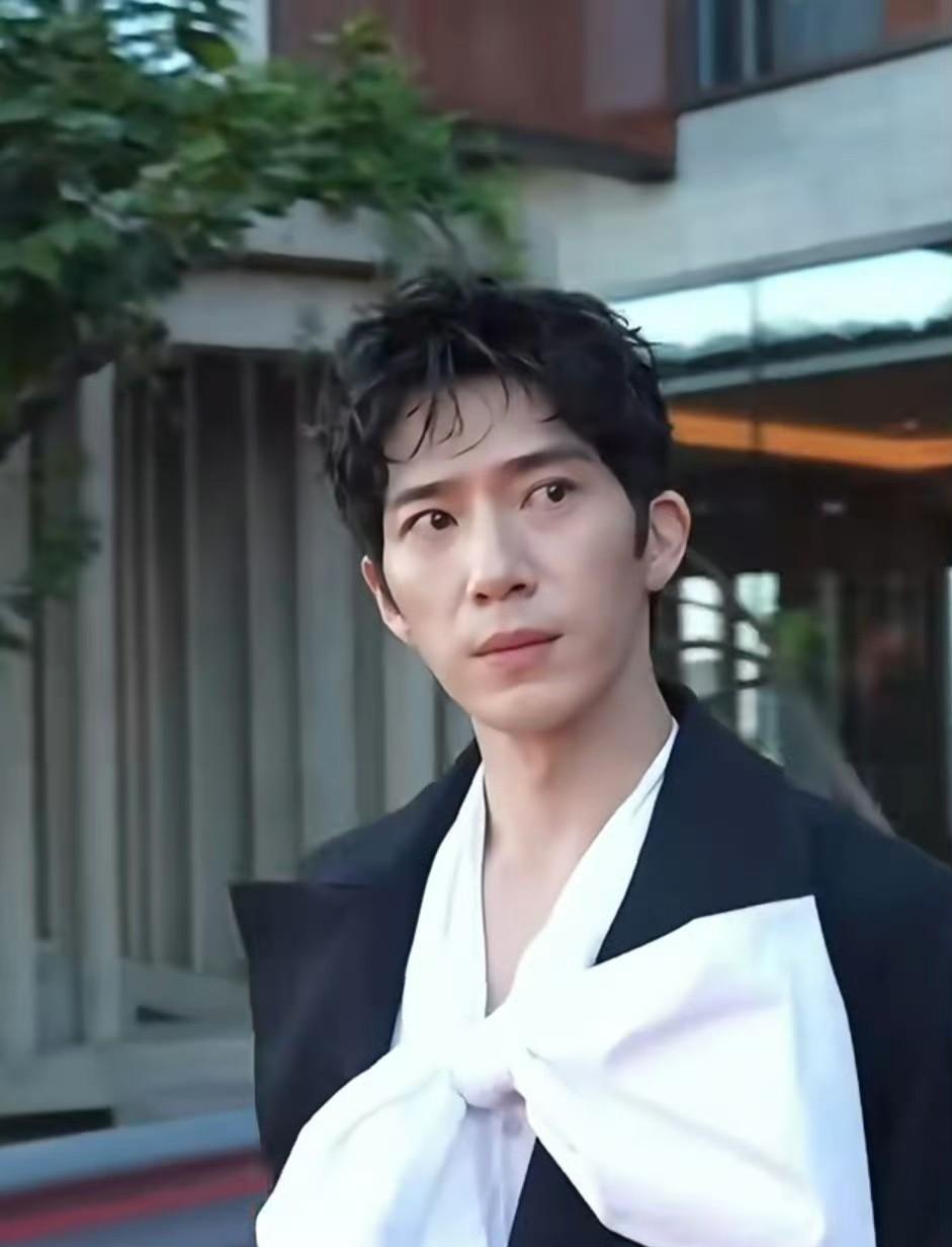 井柏然最新活动造型直接炸场! 一身黑色西装配巨型白色蝴蝶结,湿发造型慵懒又高级,